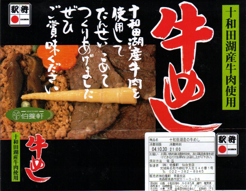 2004(平成16)年の駅弁大会シーズンに向けて投入か。これとかこれとかこれとか、似たような駅弁をいくつも食べたような気がしたのが初対面での印象。中身は御飯の上に、甘めのタレをたっぷりからめた牛肉と牛そぼろを敷くもの。肉そのものの味はブランド牛を名乗るにはちょっと厳しいか。それよりも、原材料名に明記される、十和田牛ではなく「十和田湖牛」というブランドそのものの存在を確かめられていない。そんな接頭辞を変えながら、2016年頃までの販売か。