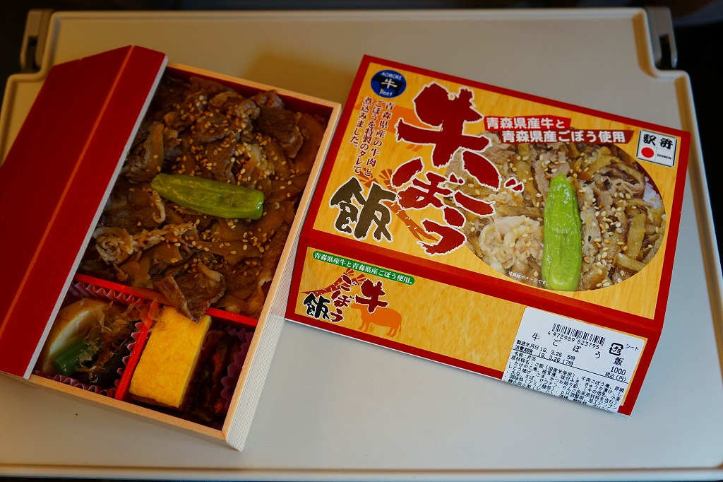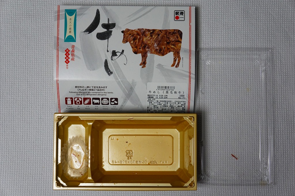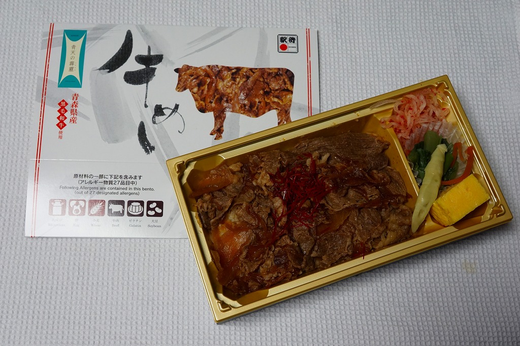 2018(平成30)年の夏頃の発売か。駅弁の名前は「青森県産黒毛和牛牛めし」とも。同じ頃に出た「青天の霹靂米日記」と同じく、青森県のブランド米「青天の霹靂(せいてんのへきれき)」を使用、その白御飯を青森県産の黒毛和牛のタマネギ炒めで覆い、唐辛子を刻み、玉子焼、わさび菜、大根漬を添える。青森づくしの牛丼のはずが、パッケージでの紹介や宣伝を含め、米と牛の味が出ていない印象。牛すき焼丼というよりはむしろ牛しぐれ丼だった。価格は2018年の発売時や購入時で1,000円、2020年時点で1,080円、2022年3月から1,200円、2024年11月から1,500円。