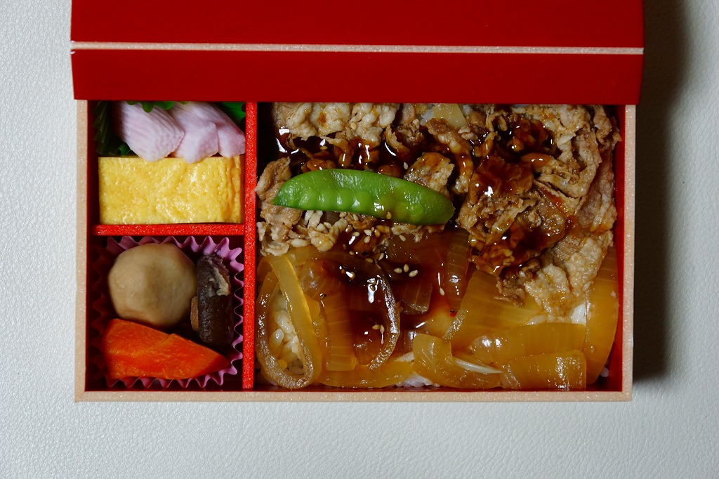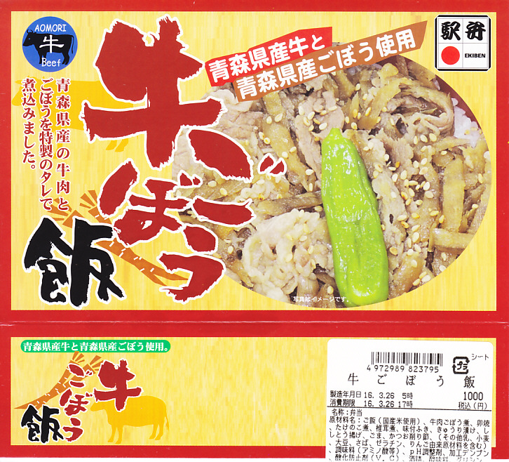 2016(平成28)年の年明け頃に発売か。白御飯の上を牛肉煮とゴボウ煮で覆い、ししとうで彩り、玉子焼、タケノコやフキなどの煮物、キュウリの漬物を添える。見た目も内容も味も一般的な牛丼駅弁。オール発泡材製の容器のふたが、めくり上げるような構造で、本体と分離しないつくりが特徴に見える。年内で終売か。