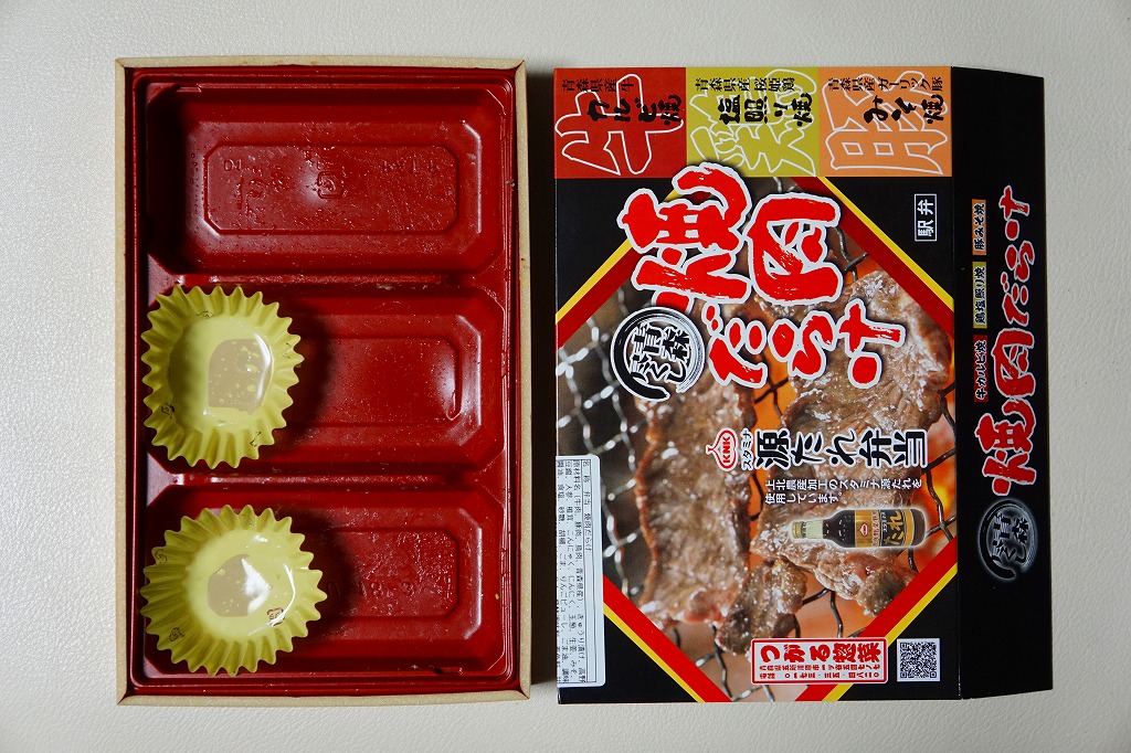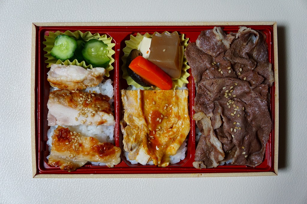 赤黒く飯からはみ出るパワフルな牛、厚さと適度な固さとしっかりした塩味がある鶏、少量のはずが厚さと脂肪の質が噛み切るのに絶妙で飯を余さない豚と、力強い内容に感じた。今回は東京駅で購入したが、輸送販売の肉駅弁にありがちな寂しさはどこにもない。価格は2016年の購入時で1,100円、2018年時点で1,300円。2019年までの販売か。