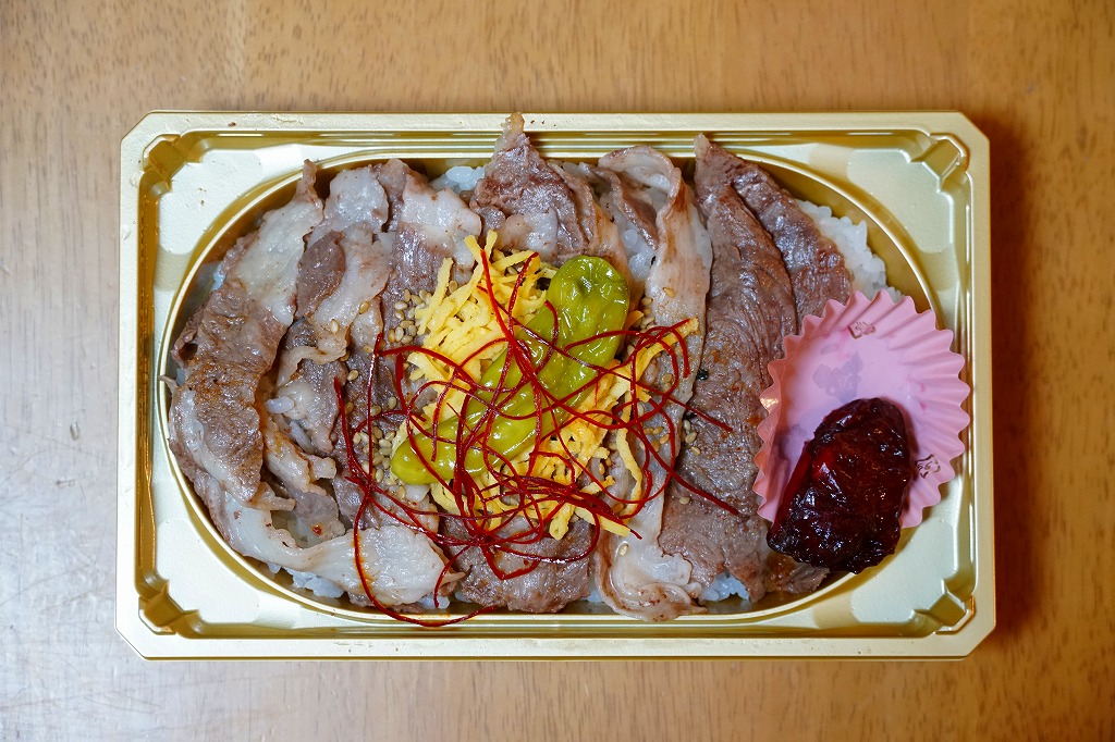コンビニ弁当並みに浅く平たいプラ容器に白飯を詰め、小川原湖牛の焼きしゃぶという牛焼肉で覆い、錦糸卵とししとうと糸唐辛子で彩り、リンゴのしそ巻き酢漬を添える。味付けのない肉の味はB級に力強く、つがる惣菜の駅弁らしい感じ。2022年までの販売か。