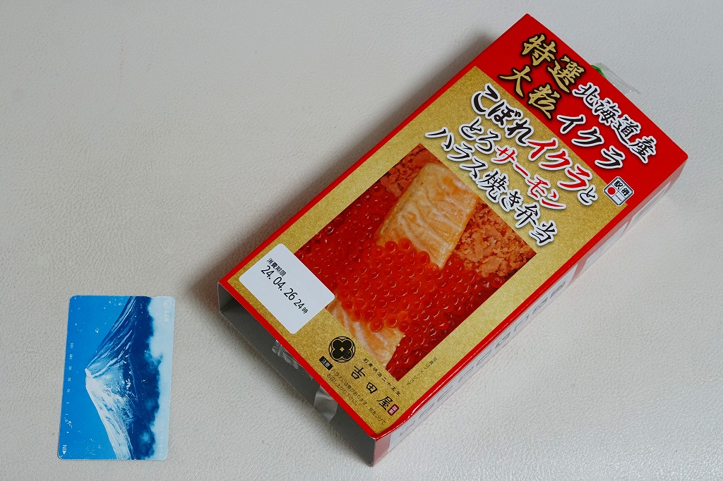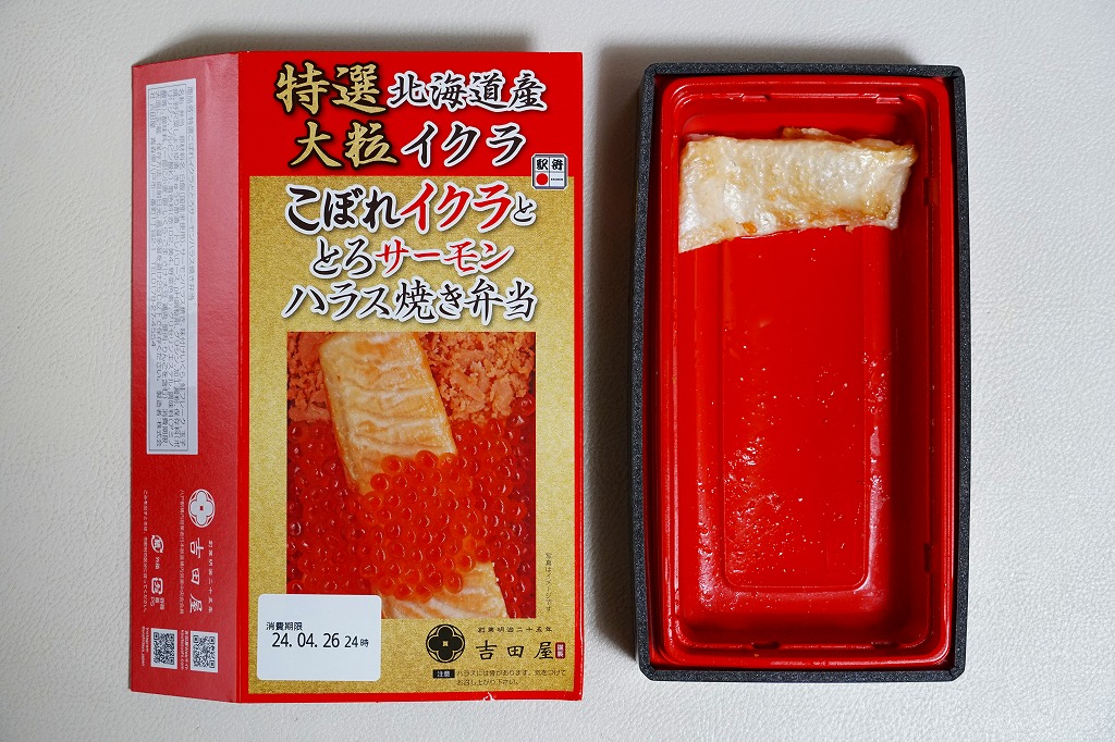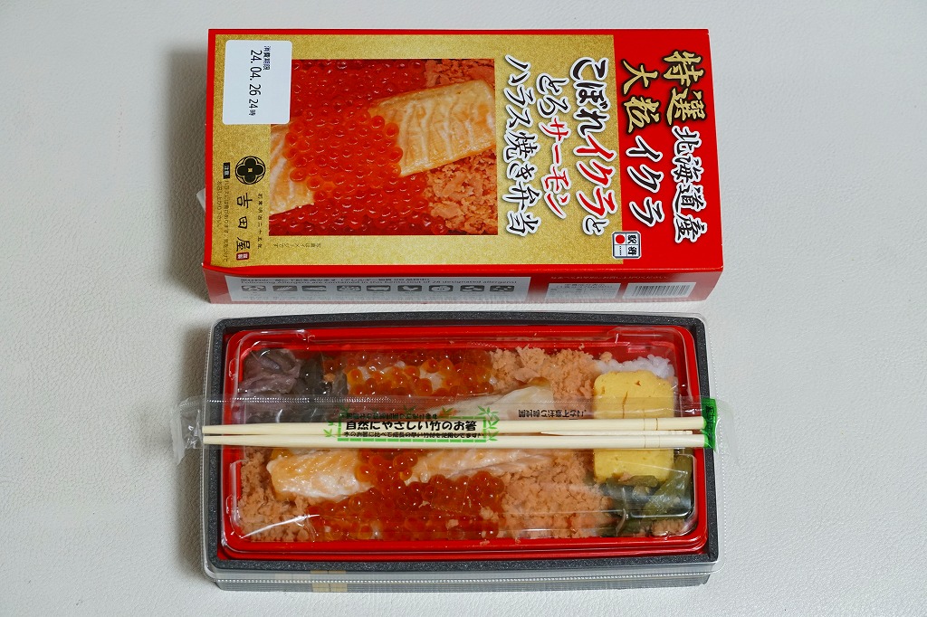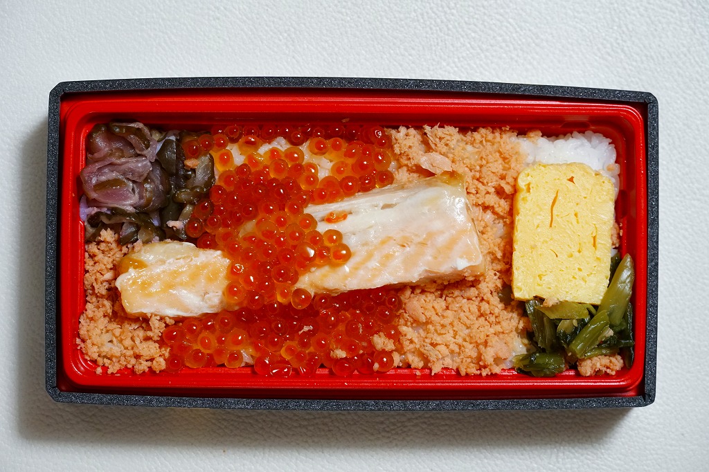 商品名と中身のクローズアップ写真を印刷したスリーブに収める長方形のプラ容器に、白飯を詰め、イクラと鮭フレークで覆い、サーモンハラス焼きを載せ、玉子焼、野沢菜しょうゆ漬、柴漬けを添える。脂が乗りすぎるようなハラスと、脂のないフレークの二段構えで、鮭の味で飯が進む。