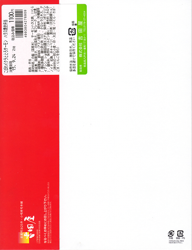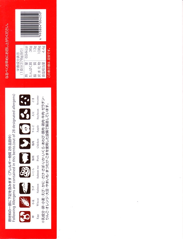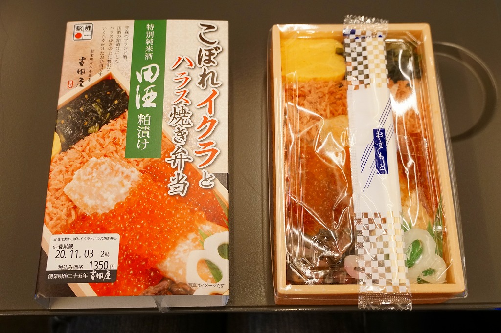 2015(平成27)年夏の新作だろうか。白御飯をサーモンのハラスとイクラと鮭フレークで覆い、柴漬けと玉子焼と小松菜を添える。中身はトロトロおいしいのだが、パッケージの写真がとても美しすぎるため、これに到底及ばない中身の見栄えで、初対面の印象が悪くなる。2020(令和2)年10月に「田酒粕漬けこぼれイクラとハラス焼き弁当」へ値上げとリニューアル。