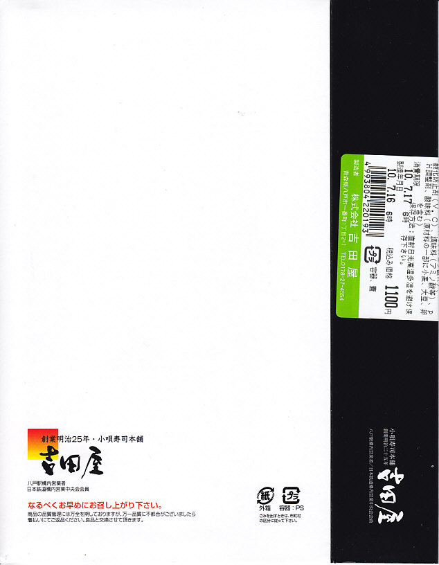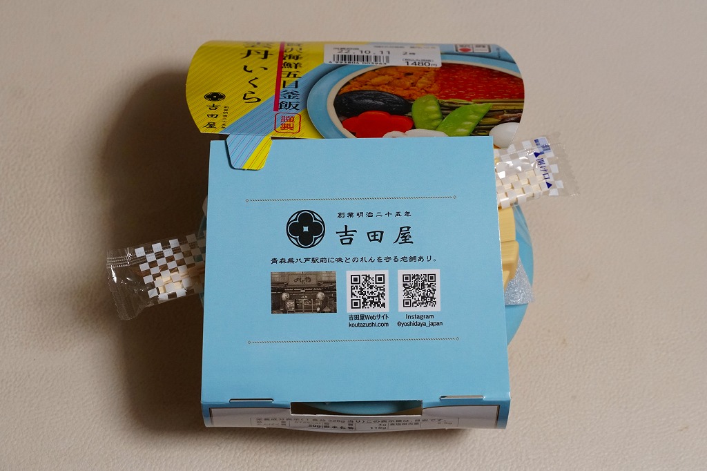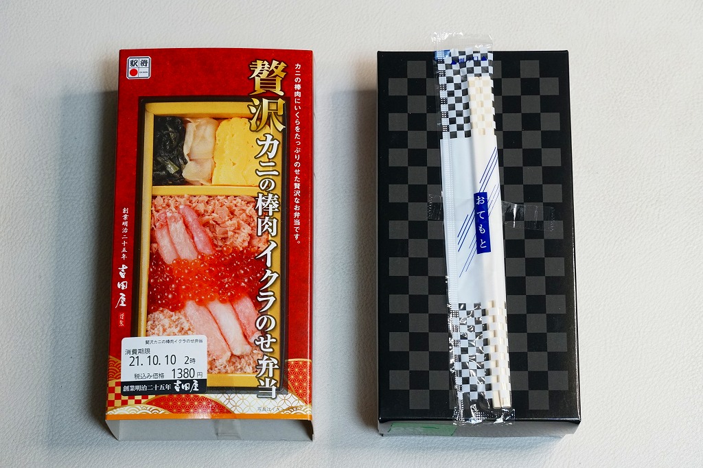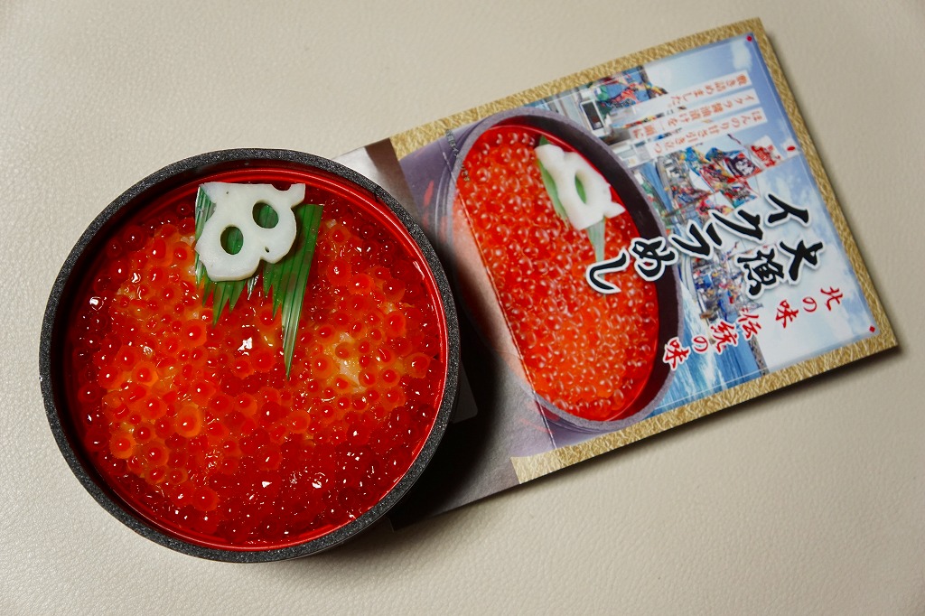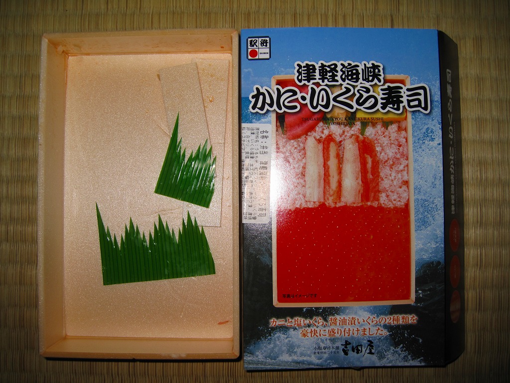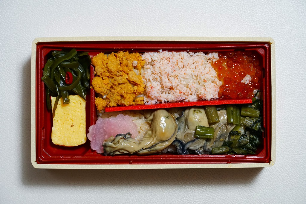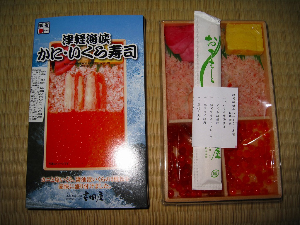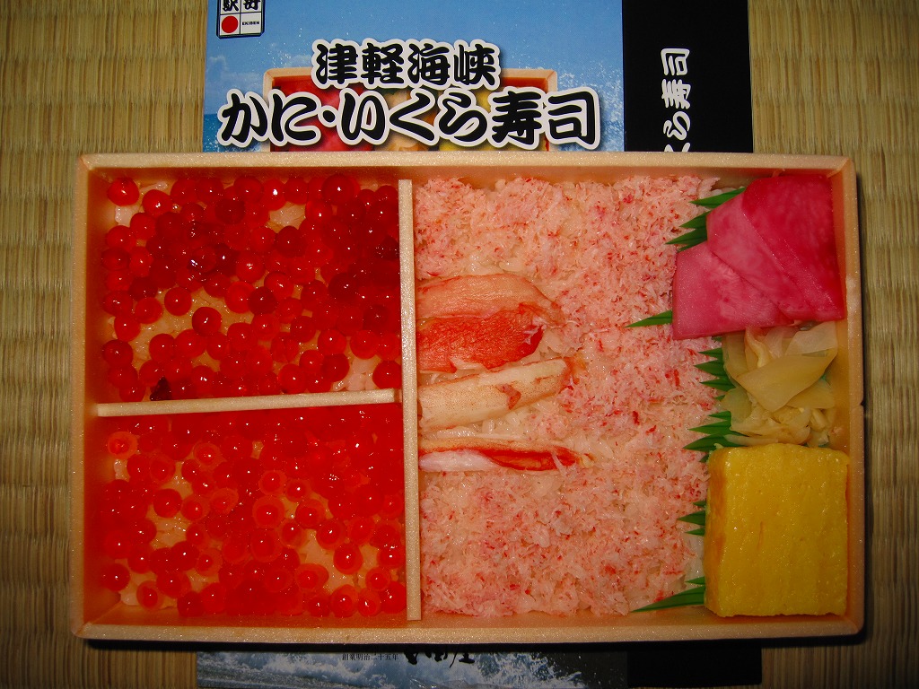 2010(平成22)年に発売か。浅く小さな長方形の容器に透明なふたをして、中身と海の写真を印刷したボール紙の枠にはめる。中身は酢飯の上にイクラ醤油漬、イクラ塩漬、ベニズワイガニのフレークとズワイガニの脚肉をそれぞれ詰めて、玉子焼、赤かぶ漬、ガリを添えるもの。