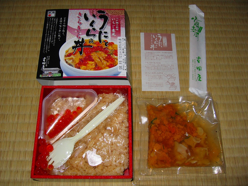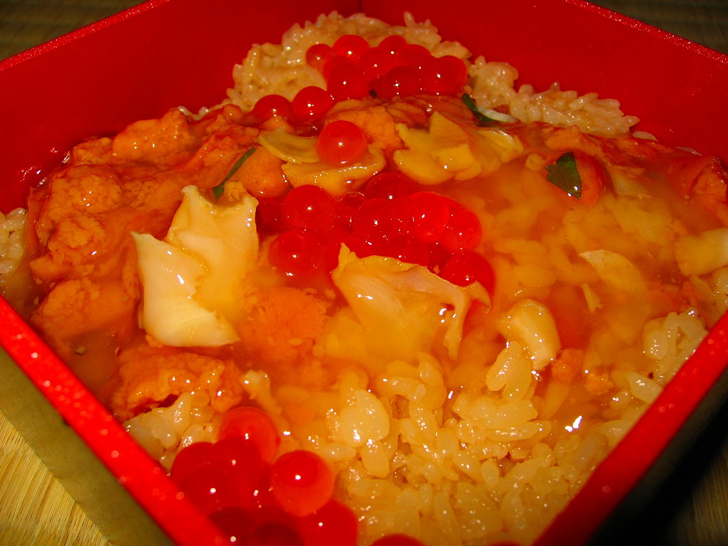 2006(平成18)年10月7日に発売。小柄な正方形の容器に透明なふたをして、しおりと割りばしを置き、中身調理例を写真で示す紙枠にはめる。中身は味付飯のみが敷かれ、イクラ醤油漬のカップと、ウニとツブ貝を混ぜたあんかけの袋が入る。カップと袋の中身を茶飯の上にぶっかけて完成する調理系駅弁。