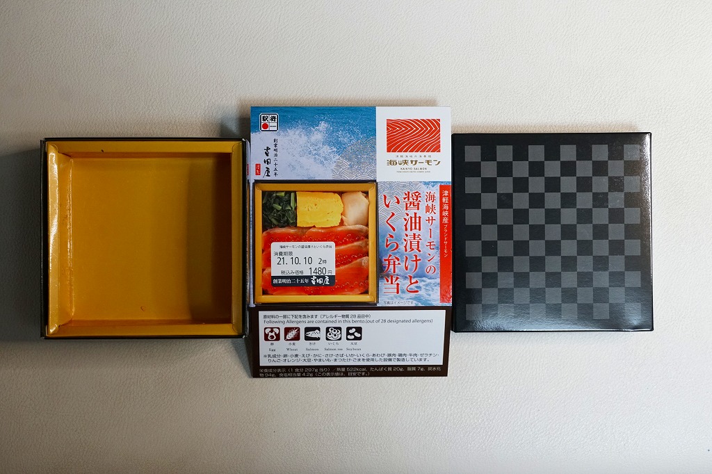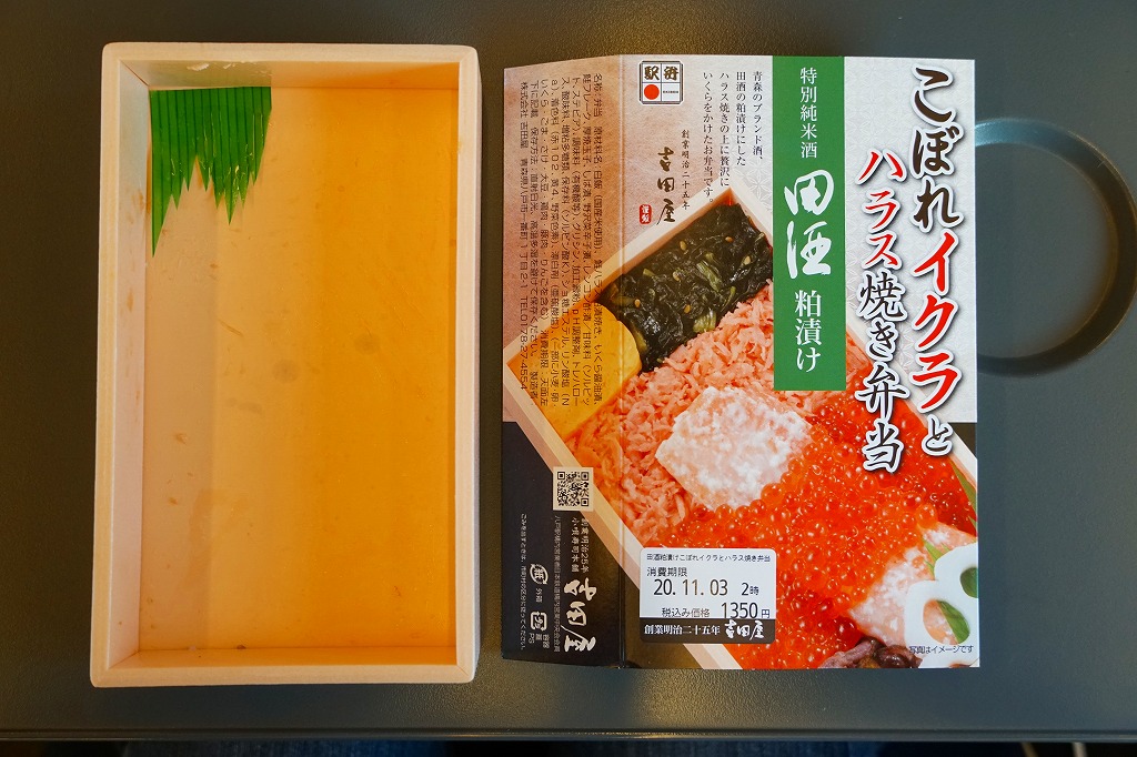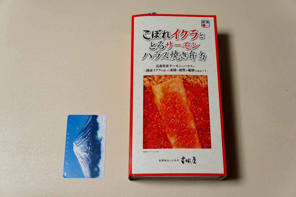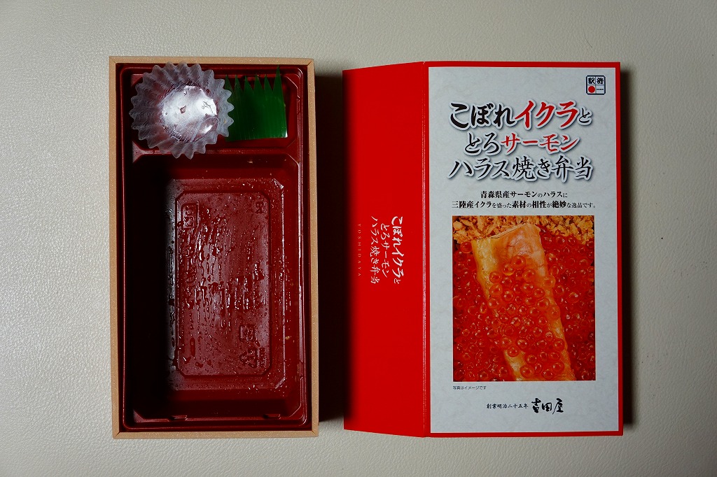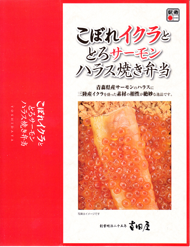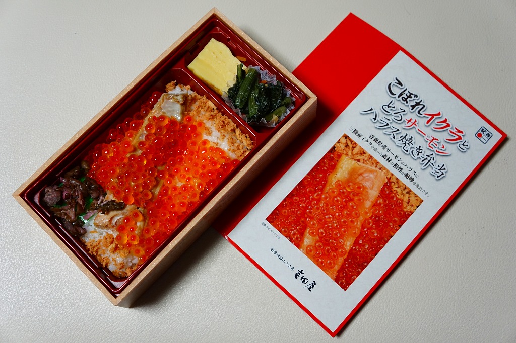 秋冬の駅弁大会シーズンに向けた、2023(令和5)年秋の新商品。調製元を見て八戸駅の駅弁としたが、八戸駅で買えたかは分からない。2024年の春までに、東海道新幹線の東京、品川、新横浜の各駅の駅弁売り場で売り始めた。その名からも内容からも、2015年発売の「こぼれイクラととろサーモンハラス焼き弁当」を手直して再発売したものではないかと思う。