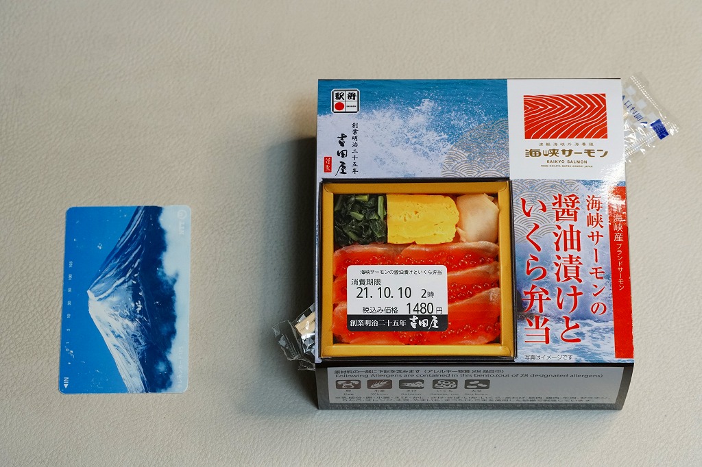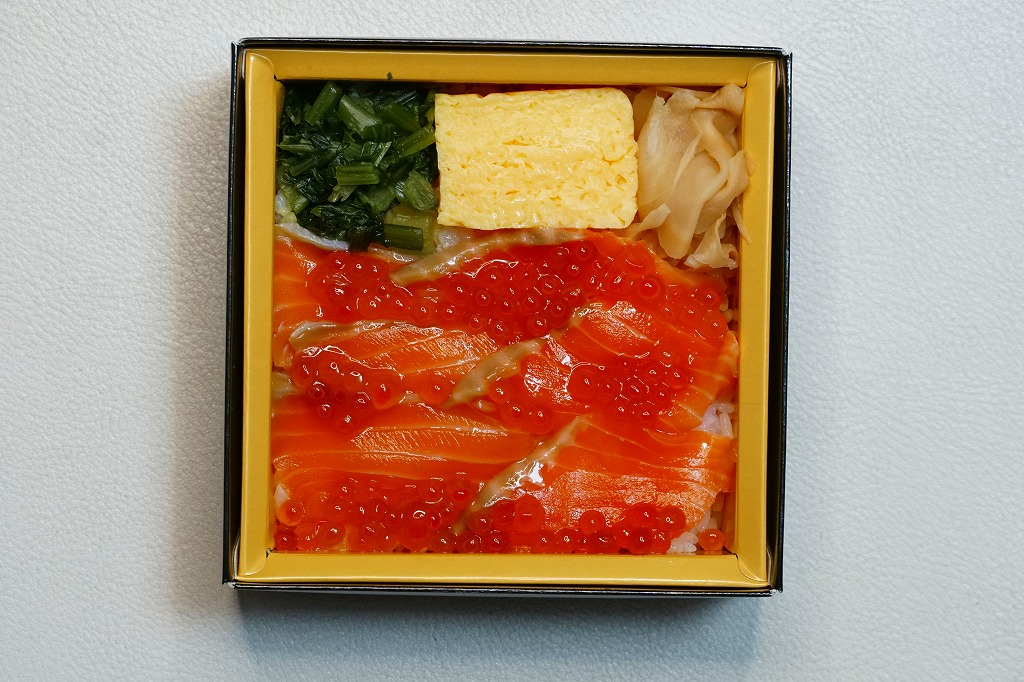 2021(令和3)年8月の発売か。10月のJR東日本の駅弁キャンペーン「駅弁味の陣2021」にエントリー。正方形の紙箱に酢飯を詰め、海峡サーモンの白醤油漬を並べ、イクラを置き、玉子焼、わさび菜、ガリを添える。小柄なのに高額な商品であっても、海峡サーモンの柔らかさと、脂と香りの絶妙さに、スリーブの見本写真に違わない具の美しさで、美味を味わえる。これより安くてサーモンが多く入る八戸駅弁「海峡漬ちらし」と売り場で並ぶと不利かも。駅弁に入る海峡サーモンは、この年に突然うまくなったと思う。価格は2021年の購入時で1,480円、2023年時点で1,600円。