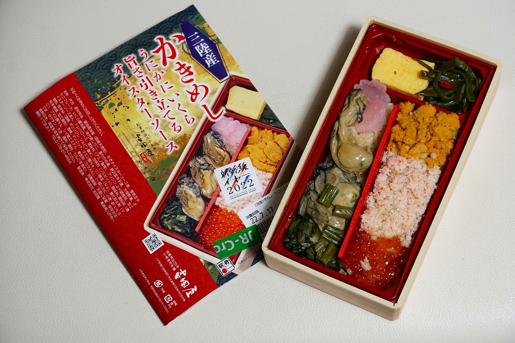 豪華に見せるだけの食材をとにかく集めたように見えて、これらを仕切りを加えてまで整然に並べたので、まるで一口サイズの海鮮丼の詰合せのよう。牡蠣を重ねた名前を持つ主役のかきオイスターソース味は、作り置きの駅弁では乾燥したり収縮しがちなカキに、とろみを付けてみずみずしさを少し与えたように思えた。価格は2022年の購入時で1,300円、2023年時点で1,380円。