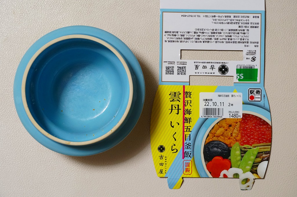 2022(令和4)年10月に盛岡駅、仙台駅、東京駅で発売か。同月からのJR東日本の駅弁キャンペーン「駅弁味の陣2022」にエントリー。水色で陶製の釜飯駅弁向け容器に、プラ製のふたをして、中身の写真を使うスリーブで留める。中身は茶飯を山菜、イクラ、蒸しウニ、うずら卵、しいたけ、にんじん、れんこん、きぬさや、ぎんなんで覆うもの。水色あるいは空色の容器は、駅弁であまり使われないとは思う。商品名どおりの内容で、催事向けの商品に感じる。価格は2022年の購入時で1,480円、2023年時点で1,580円。