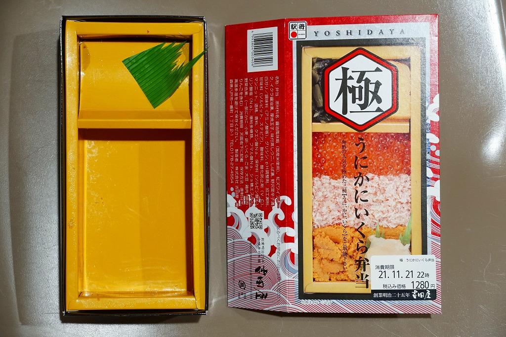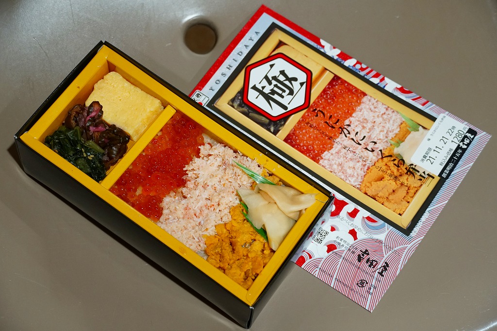 秋冬の駅弁大会シーズンに向けた、2021(令和3)年秋の新商品。紙製の容器に茶飯を詰め、蒸しウニ、ベニズワイガニのほぐし身、イクラの醤油漬で3分の1ずつ順番に覆い、ガリを添え、玉子焼、柴漬け、野沢菜を添付。中身と名前を合わせた、食べて華やかな商品。催事向けに見えるこの内容で、酢飯を使わないのは、ちょっとありがたい。価格は2021年の購入時で1,280円、2023年時点で1,330円。