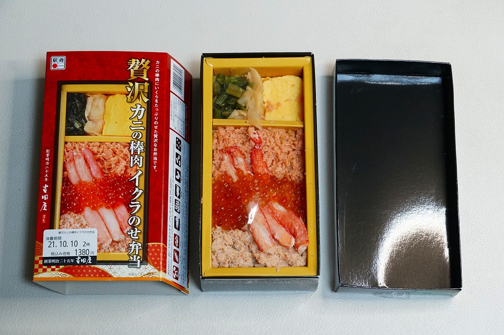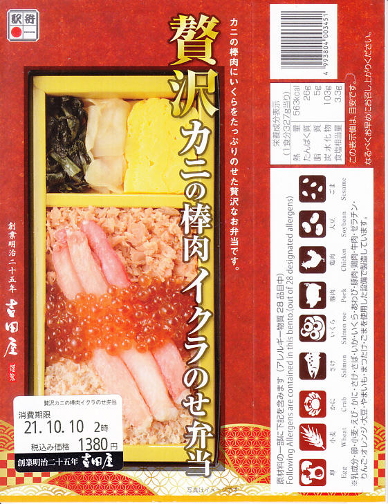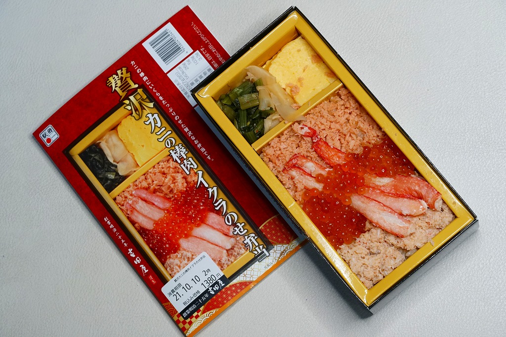2021(令和3)年9月までに発売か。10月のJR東日本の駅弁キャンペーン「駅弁味の陣2021」にエントリー。長方形の紙箱に茶飯を詰め、鮭フレークとベニズワイカニのほぐし身で覆い、同カニの棒肉を並べてイクラで彩り、玉子焼と野沢菜とガリを添える。新作であっても、内容は過去や他駅にもあるもので、味も見た目どおりにできているので、安心して買って食べてよい駅弁だと思うし、印象に残ったり人気が出たり長く親しまれる駅弁でない気もした。価格は2021年の購入時で1,380円、2023年時点で1,500円。