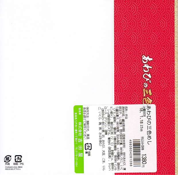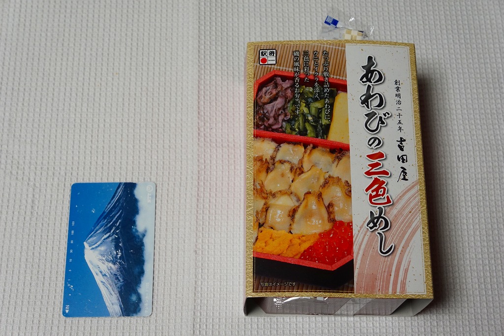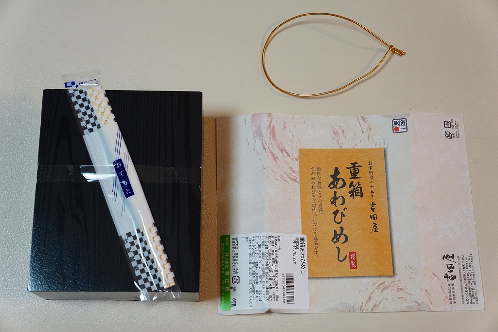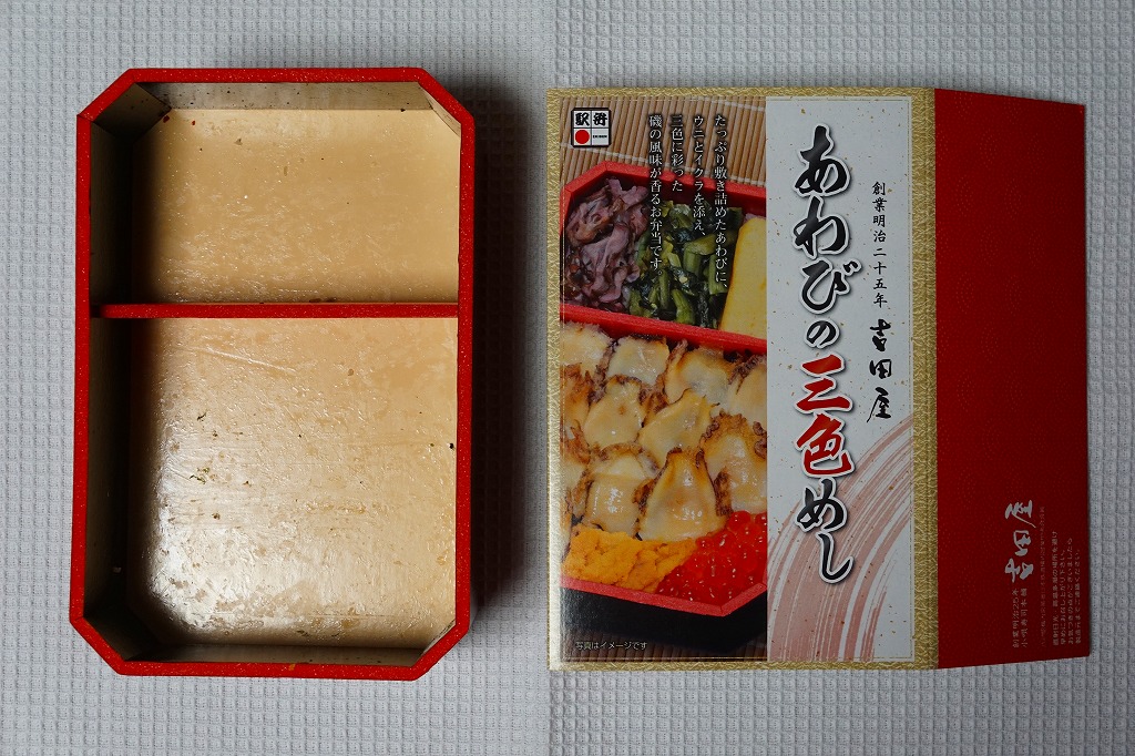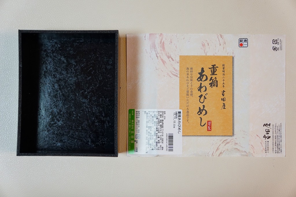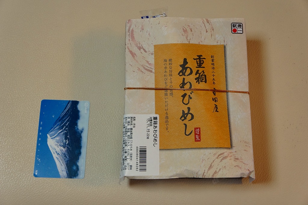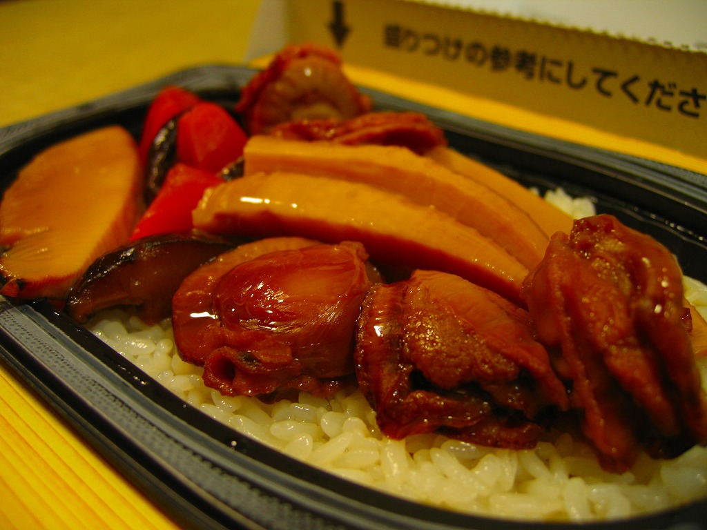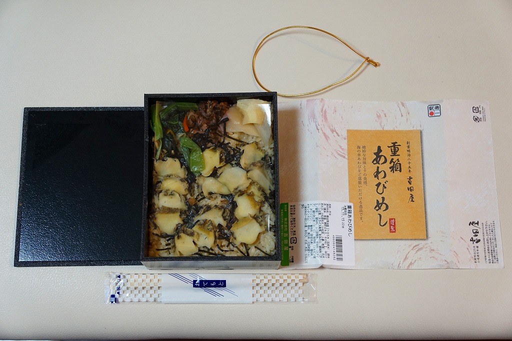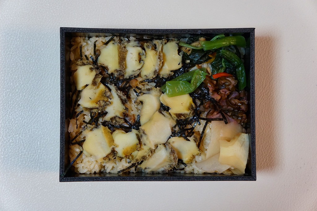 「重箱」を名乗るも重箱を使わず、上げ底容器に身を薄く敷く一階建。茶飯に刻み海苔をまぶし、細かいアワビのスライスをちりばめ、小松菜とガリと柴漬けを添える。メインのアワビは、かまぼこのような味と柔らかさ。こういう淡い味と同じ空間に、柴漬けという刺激物を詰めるなど、おかしい、もったいない、みっともないと思った。2016(平成28)年度までの販売か。