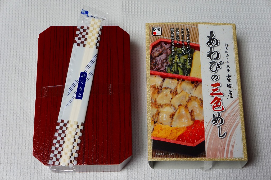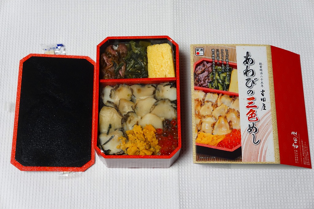 秋冬の駅弁大会シーズンに向けた、2016(平成28)年秋の新商品か。茶飯を多くのアワビに少々のウニとイクラで覆い、玉子焼と野沢菜と柴漬けを添える。付合せの下にも茶飯を詰めた重量級駅弁。2年前の下記「重箱あわびめし」に、かなり似ていると思った。2019年の春頃までの販売か。