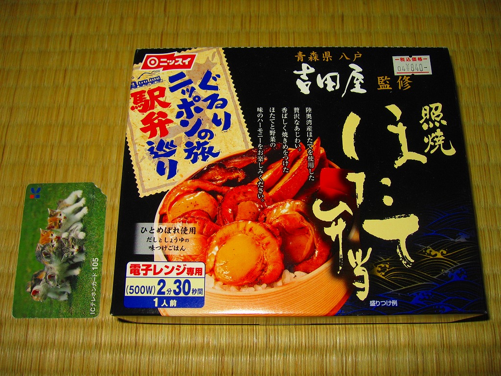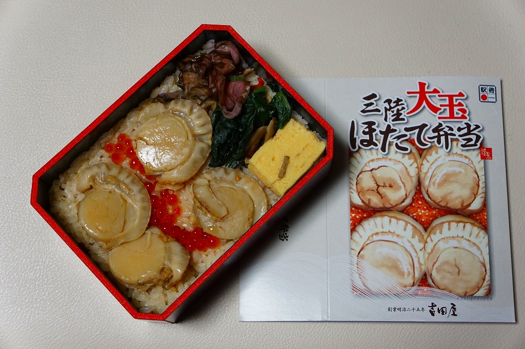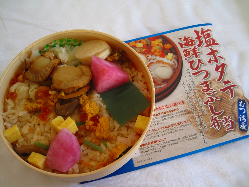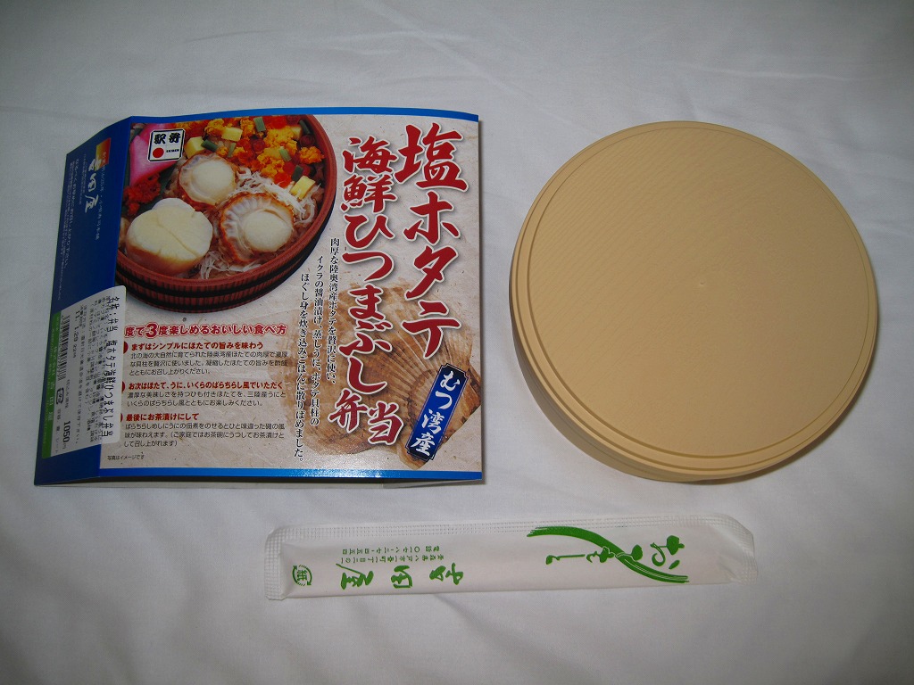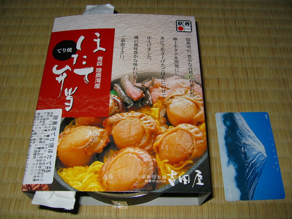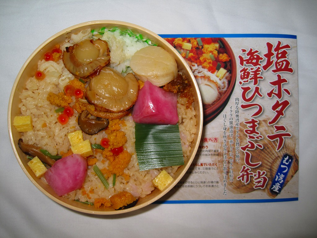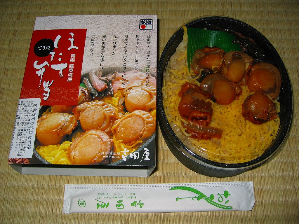 2009(平成21)年の夏までに発売か。表面を木目仕上げとした固いプラスティック製の円形の容器を、駅弁の名前と中身の写真とホタテの貝殻と食べ方を印刷したボール紙の枠にはめる。中身は茶飯の上にホタテの塩焼き2個と貝柱1個、玉子焼の角切りとウニとイクラ、赤かぶ漬、うに佃煮などを散らすもの。中身は写真ほど具だくさんで美しくはなかったけれど、内容に八戸駅弁として目新しいものはないから、味は保証済。2011年までの販売か。