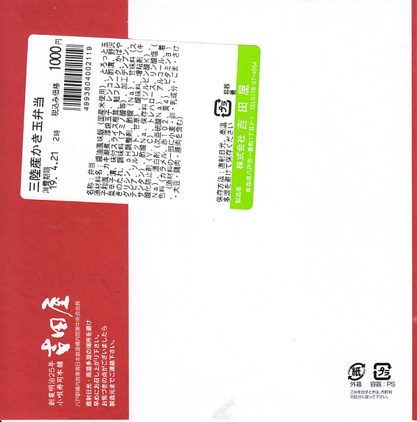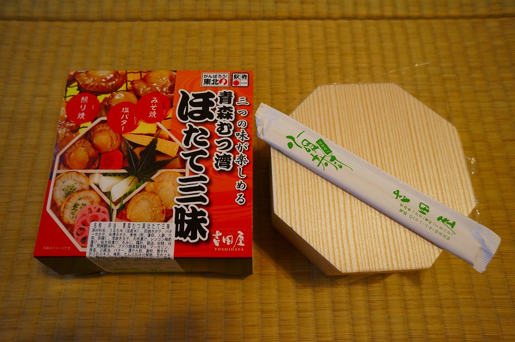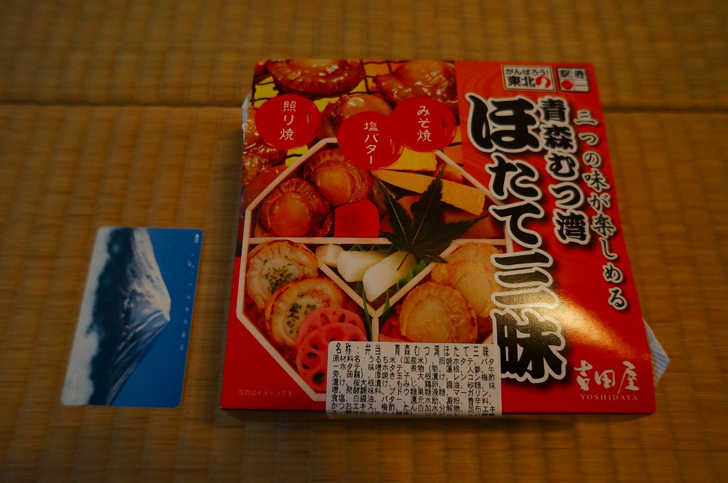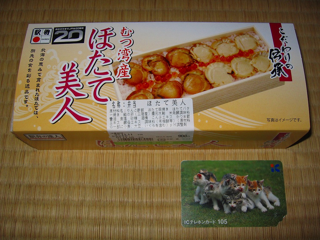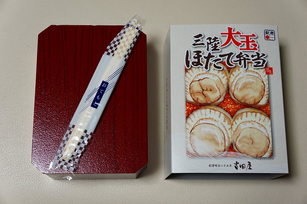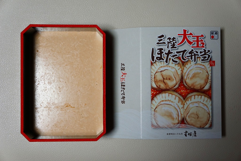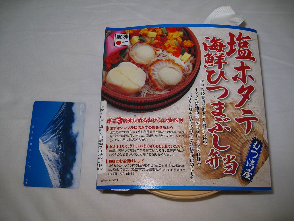 2009(平成21)年の夏までに発売か。表面を木目仕上げとした固いプラスティック製の円形の容器を、駅弁の名前と中身の写真とホタテの貝殻と食べ方を印刷したボール紙の枠にはめる。中身は茶飯の上にホタテの塩焼き2個と貝柱1個、玉子焼の角切りとウニとイクラ、赤かぶ漬、うに佃煮などを散らすもの。中身は写真ほど具だくさんで美しくはなかったけれど、内容に八戸駅弁として目新しいものはないから、味は保証済。2011年までの販売か。