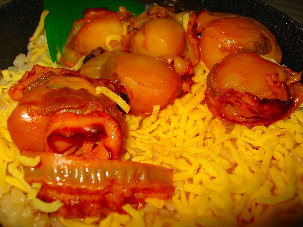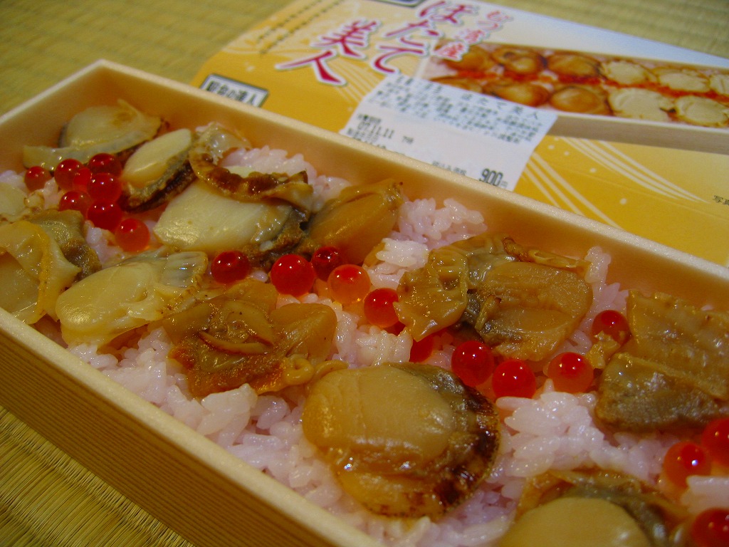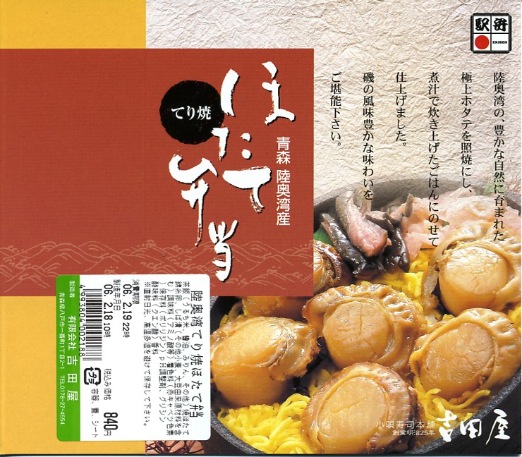 2003(平成15)年の末頃に発売か。黒い楕円形の容器にプラ製の透明なふたをして、中身の美しい写真を載せた紙枠にはめ、割り箸を刺す。中身はその写真ほど美しくはないが、煮汁で炊いた茶飯の上に柔らかくテリの良い中型帆立が6個ほど載るもので、なんとも食べ応えがある帆立丼。八戸は陸奥湾には面していないものの、ここで出会える帆立駅弁に不自然な感じはしない。価格は2006年の購入時で850円、2008年7月1日から880円。2009年頃までの販売か。