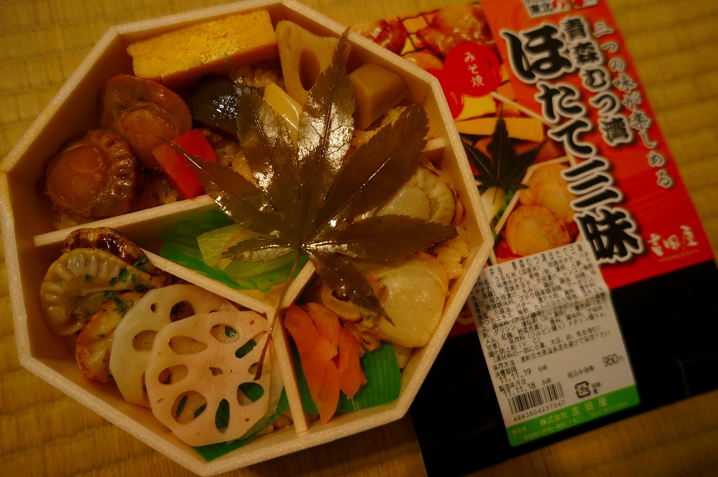 2011(平成23)年の9月までに発売か。正八角形の容器を、中身とそのイメージの写真を美しく印刷したボール紙の枠にはめる。中身は茶飯の上を小さなホタテの味噌焼にニンジンやゴボウなどの煮物と玉子焼で覆う区画と、茶飯の上を小さなホタテのバター焼とレンコン梅酢漬で覆う区画と、茶飯を小さなホタテの照り焼と大根桜漬で覆う区画と、大根漬の区画で構成され、本物のもみじの葉を添えるもの。見ればホタテは小さいものが各2個ずつしかはいていないが、他のおかずがしょぼい(失礼)こともあり、ホタテづくしという印象は強く感じた。御飯だらけの駅弁でもある。1年間ほどの販売か。