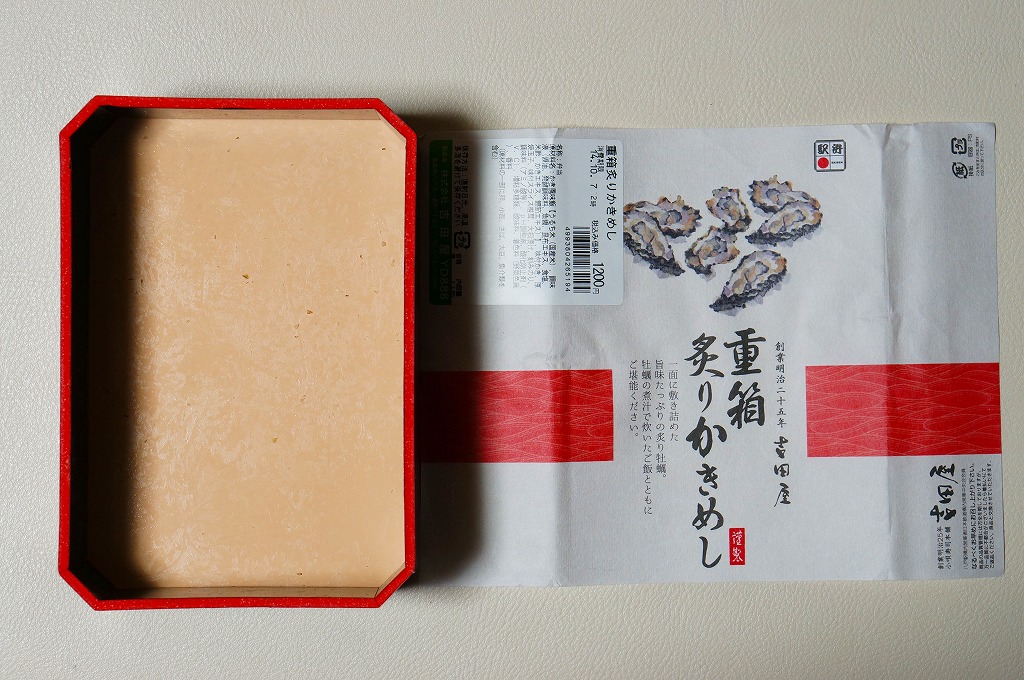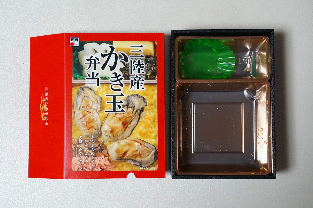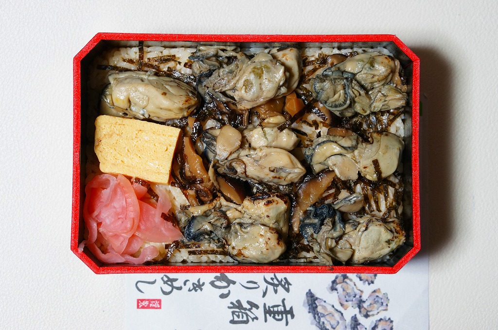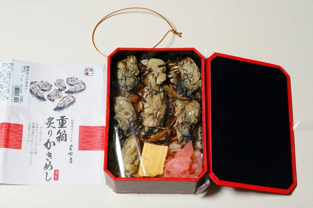 「重箱」を名乗るも重箱を使わず、上げ底の容器にカキ風味御飯を薄く敷き、海苔とシイタケを刻んで覆い、カキ7個を列べ、玉子焼と大根漬を添える。常温でクリーミーなカキを食べる駅弁としては、他駅に遜色のないものだと思った。2016(平成28)年度までの販売か。