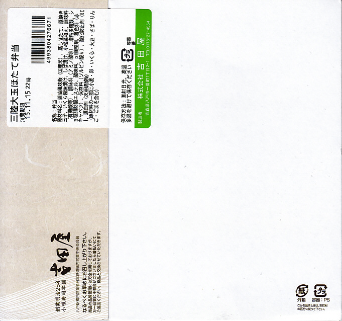側面のロゴマークに加えて容器の激しい上げ底にも催事臭を感じるが、御飯、帆立、風味のやわらかさは駅弁の域を超えており、催事で名を売ったうえで現地にて定番になるのではないかと思うし、実際にこの2007−2008年の駅弁大会シーズンの駅弁催事では人気を集めた。京王の駅弁大会から会期中に追放された事実は、ちょっと気になる。半年間ほどの販売か。