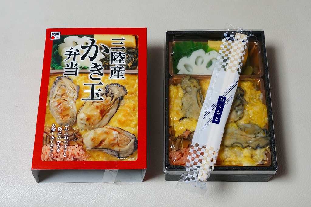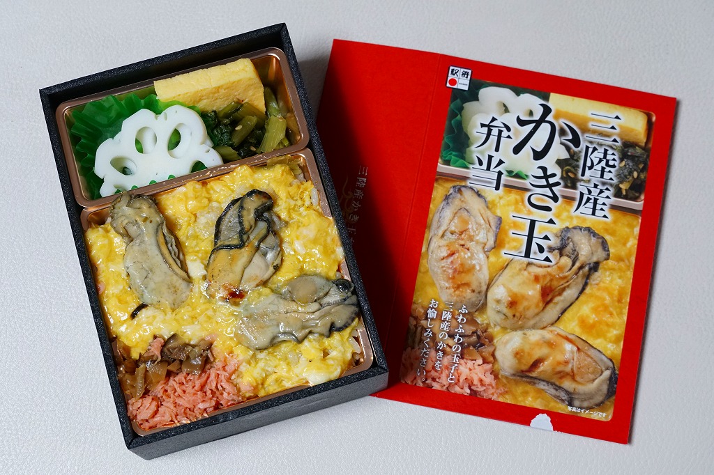 秋冬の駅弁大会シーズンに向けた、2018(平成30)年秋の新商品か。白飯を液卵で覆い、カキ煮3個を置き、鮭と椎茸のフレークを添え、少々の付合せ。カキも分量も控えめで、気楽に食べられる軽食。カキと卵という食材と調理で消費期限を丸一日持たせられる技術に感心する。秋冬の駅弁大会シーズの終わりをもって、半年間ほどで終売か。