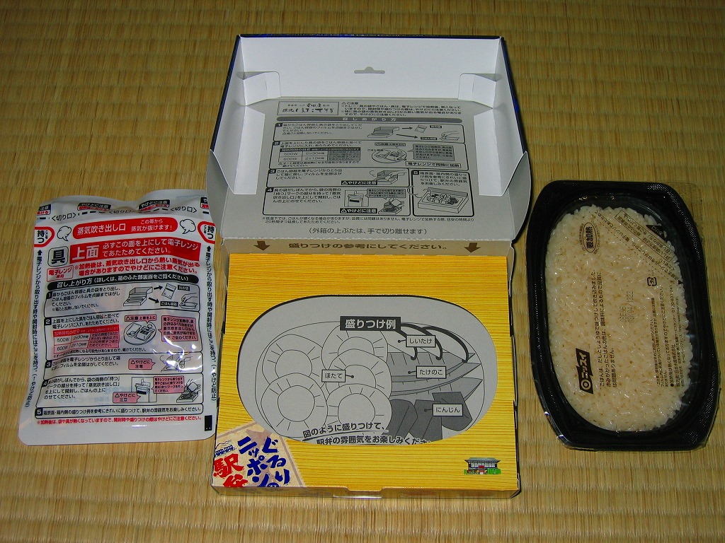 2008(平成20)年3月1日に釧路、八戸、米沢、都城の4種が誕生した、駅弁屋の監修によるレトルト弁当。パック御飯とレトルトを、調理例の写真や監修元や商品名などを掲載したボール紙の箱に詰める。パック御飯とレトルトを電子レンジで暖めて、レトルトの中身を御飯の上にかけて、パッケージの枠に収めてできあがり。