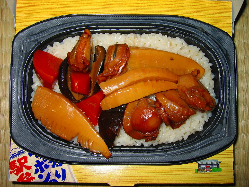 中身は味付飯の上に、暖めたレトルトに入っていたホタテ、タケノコ、シイタケ、ニンジン。八戸駅弁の「てり焼ほたて弁当」とは中身が異なり、八戸駅の駅弁と1対1に対応する商品はないと思うが、ホタテ駅弁の雰囲気は出ていると思う。ただ、味は少々酸っぱい感じ。
