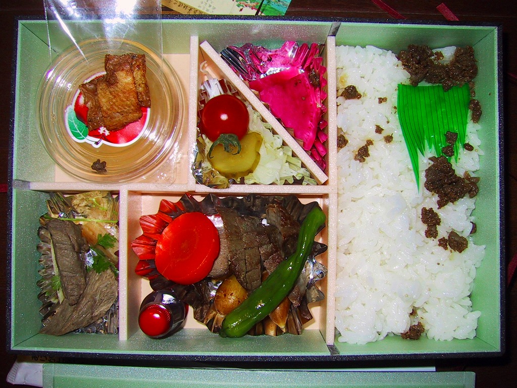 東北新幹線の八戸延伸に合わせて、2002(平成14)年12月1日に発売。内側が青く外側が黒い木目調の独特な容器に、郷愁を誘うセピア色の写真を載せた掛紙をかけて紫色の紙ひもでしばる。中身は牛肉が少ない牛肉弁当といえ、白御飯に倉石牛の網焼やそぼろや佃煮などが入り、デザートに見えるカップは濃縮還元をしていないりんごジュース。味は良いのに価格の割に隙間が多く見た目で損をしているが、御飯を除きすべてが倉石村産の食材を使用したというから、村の豊かさを感じさせる。