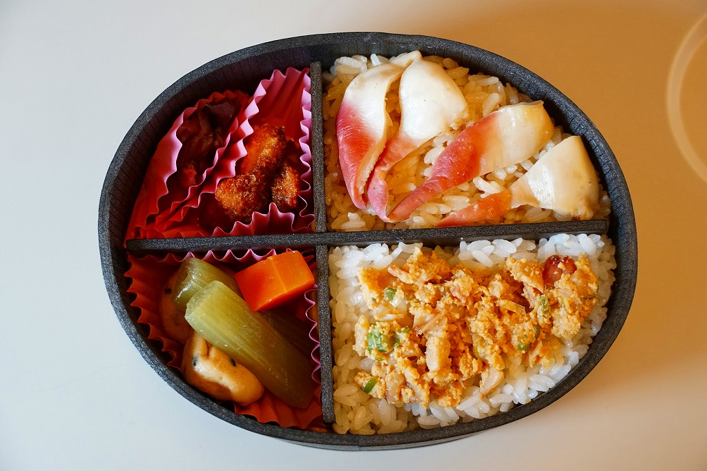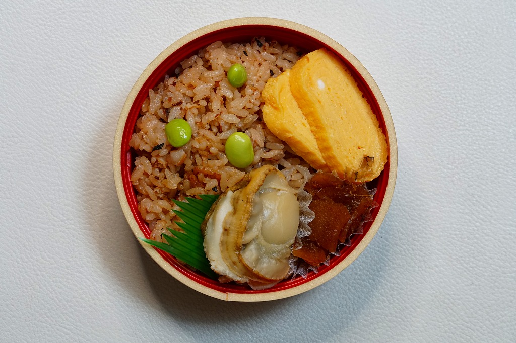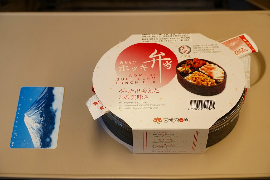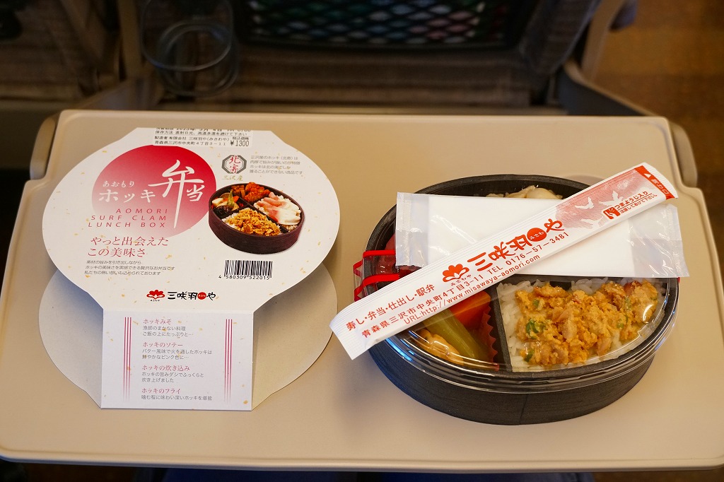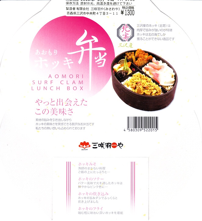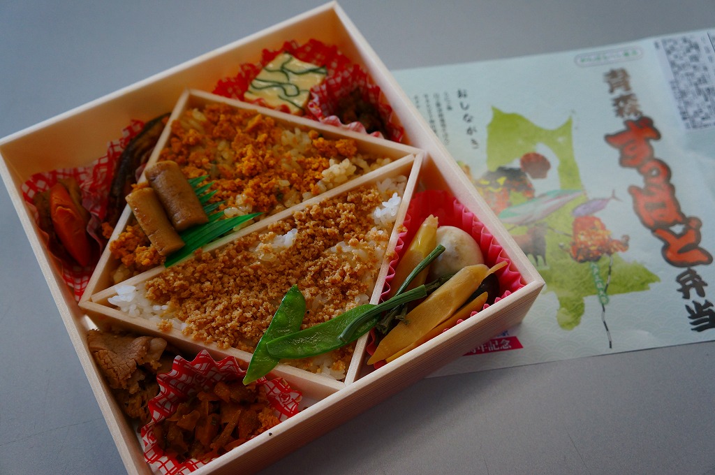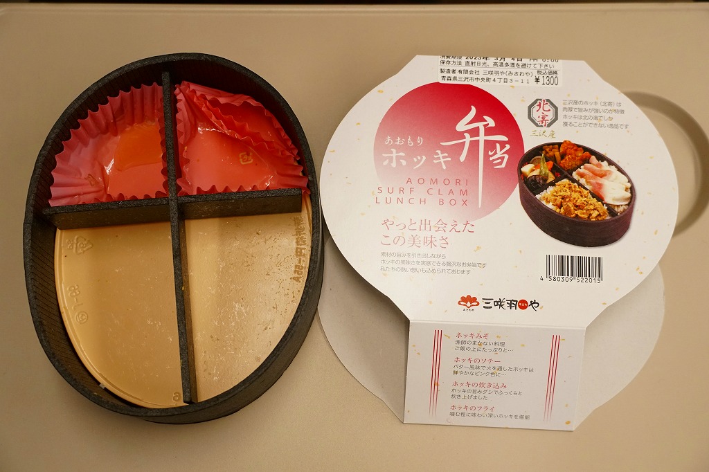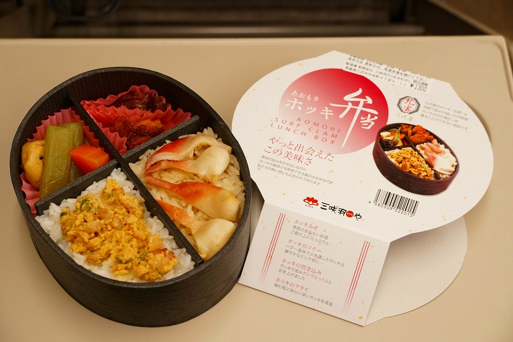 2010(平成22)年12月の東北新幹線全線開業とともに、八戸駅で発売か。この内容の弁当はその頃には、調製元の本業である三沢市内の小僧寿しチェーンで売られていたらしい。楕円形の容器は4つに区画され、ホッキのソテーを載せた炊き込み御飯、ホッキみそ丼、ホッキのフライと柴漬け、フキとニンジンの煮物にがんもどき。常温で作り置く駅弁も回転寿司などでも、どうしても固かったり臭みが出がちなホッキ貝にあって、これは不思議と普通に食べられて、味噌和えに揚げ物と個性的な姿もいただける。知名度はないけれど、優れた駅弁。価格は2020年時点で1,300円、2025年時点で1,490円。
