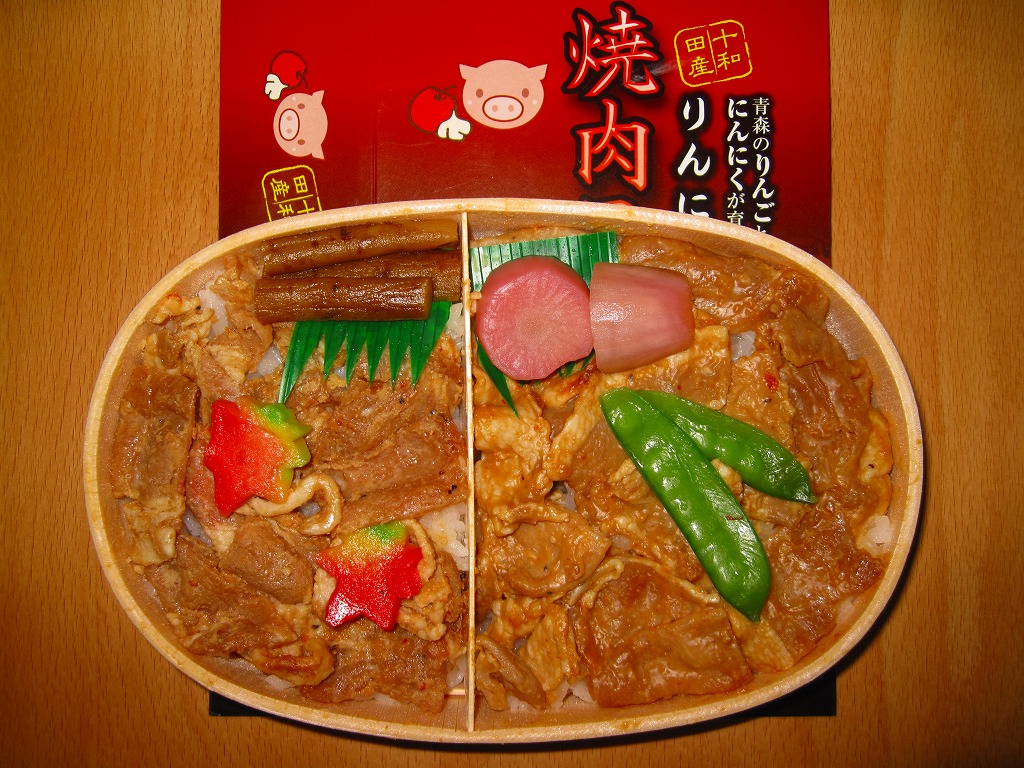 中身は半分が白御飯の上に豚肉味噌焼を、半分が白御飯の上に豚肉醤油焼を、飯の中と上に重ねる豚焼肉弁当。これにきぬさや、もみじ麩、ごぼうを添える。リンゴの繊維とニンニクを混ぜた飼料で育ったという「林大豚(りんにんとん)」の豚肉は見た目に白い脂が少々浮いているが、臭みもなく飽きない感じ。しかし同時デビューの「せんべい汁弁当」のインパクトが強烈であるため、こちらは話題になっていない。
