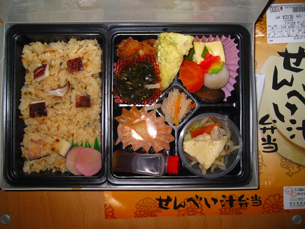 中身はイカをまぶしたウニ飯に、イカ磯部揚、鶏唐揚、昆布煮、サトイモやニンジンなどの煮物、ダイコンとニンジンとたらこの和え物、リンゴゼリーと、メインの「せんべい汁」。プラ製カップにせんべい、キャベツ、ニンジン、ごぼう、ネギが入っており、これにボトルのだし汁をかけて食べる。個性はそこだけで、他はキワモノでもゲテモノでもない、雰囲気と風味の良いお弁当。