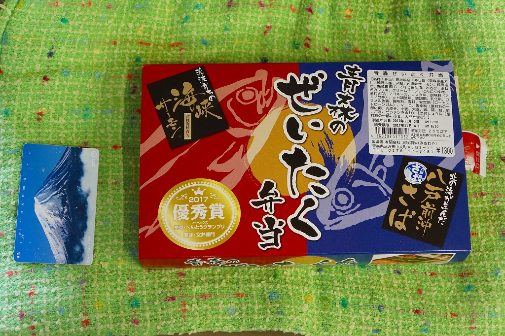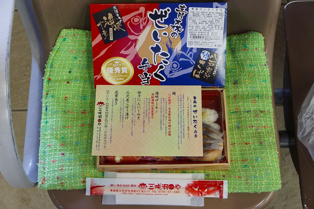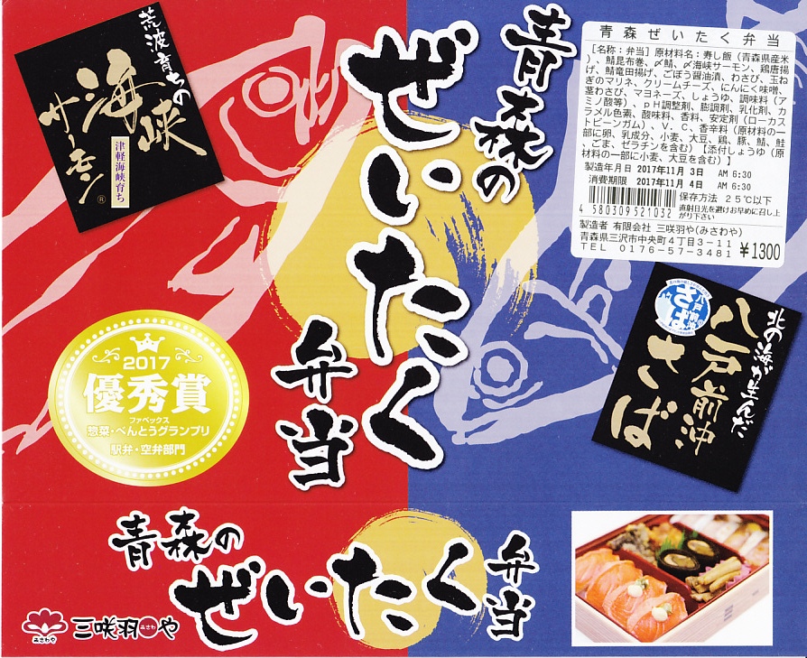 上記の駅弁「青森のぜいたく弁当」の、2017(平成29)年時点での姿。上記の2025年のものと、ほぼ同じ。八戸前沖さばの竜田揚げが玉子焼きに変わり、スリーブではひとつ賞を重ね、さばから八戸前沖が取れただけの違い。