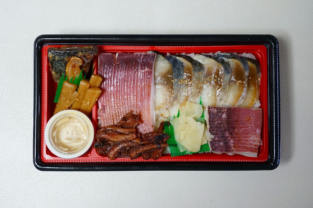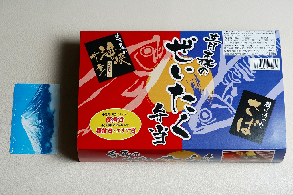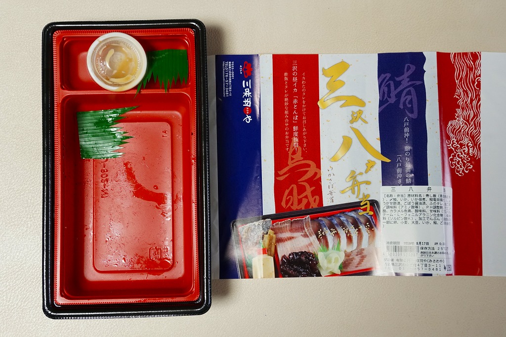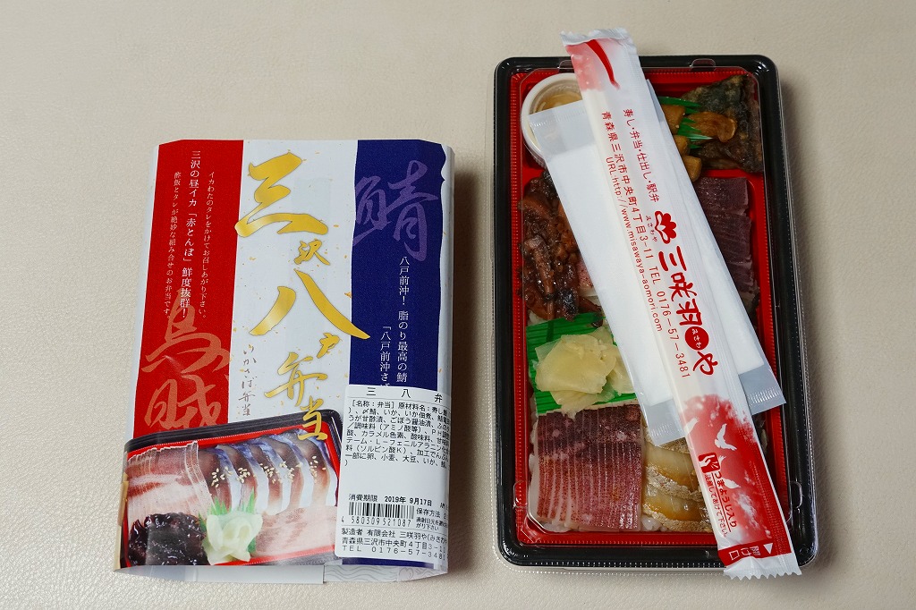 長方形の容器に酢飯を詰め、薄く薄くスライスしたイカ一夜干しやサバで覆い、イカゲソやサバ竜田揚や生姜やごぼうなどを付け合わせる。三沢沖地域ブランドの昼イカ「赤とんぼ」というイカが新鮮で、銀鯖(八戸前沖鯖)というサバにも脂が乗り、控えめな見栄えに違い味は極上。食べて食べ比べた人だけで票を数えれば、きっと駅弁味の陣の駅弁大将軍になれる。無名のままにしておくには惜しい、とてもうまい駅弁。価格は2020年時点で1,250円、2025年時点で1,380円。