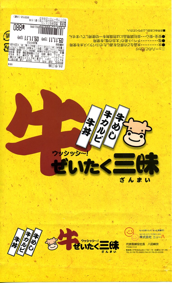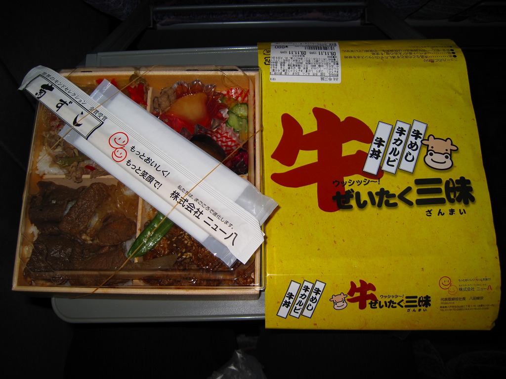 東北で数々の名誉賞を受賞しているという、青森県三戸郡倉石村特産の「倉石牛」は、冷たいのに柔らかさとサクッとした食感に牛肉らしい風味が備わるなど、中身は申し分なし。あとは原材料や消費期限を印字したシールをなんとかすれば、絵にもなる駅弁になれるはず。なお、倉石村は2004年7月1日に五戸町と合併し消滅した。