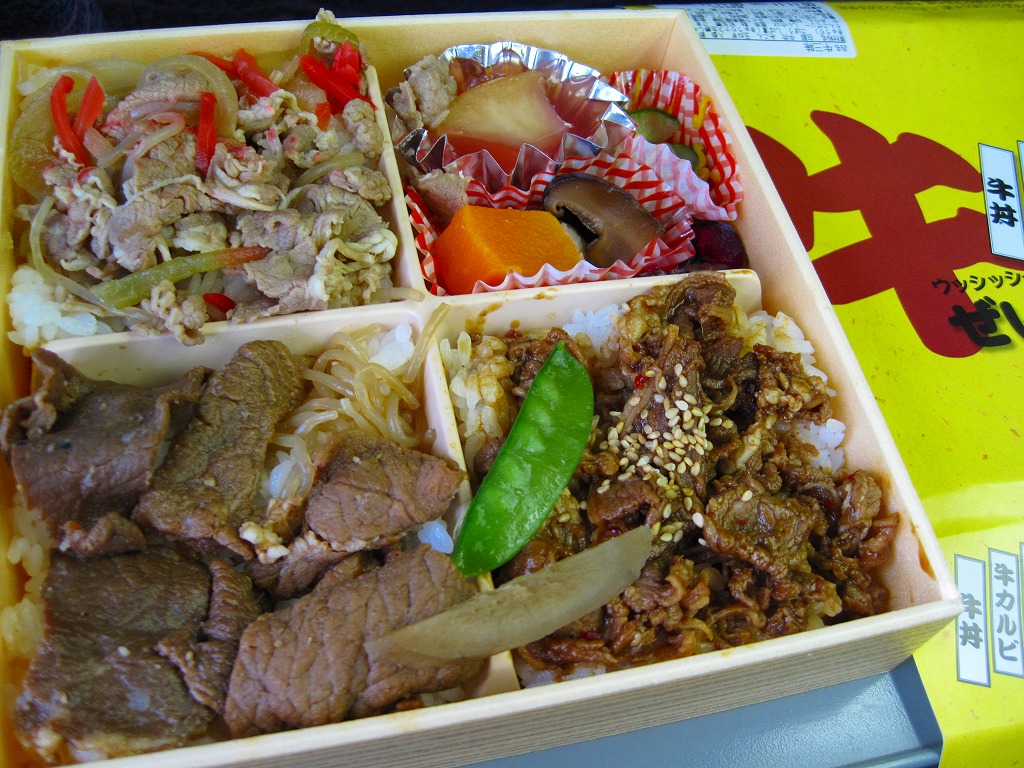 2007(平成19)年に発売か。正方形の華奢な容器に透明なふたをして、おしぼりと割りばしを置いて輪ゴムで留め、商品名を書いた黄色い掛紙を巻いて、セロテープで留める。田の字の中身はそれぞれ、牛丼、牛カルビ丼、牛めし、煮物やキュウリと菊の酢の物やリンゴゼリーなどのおかず。