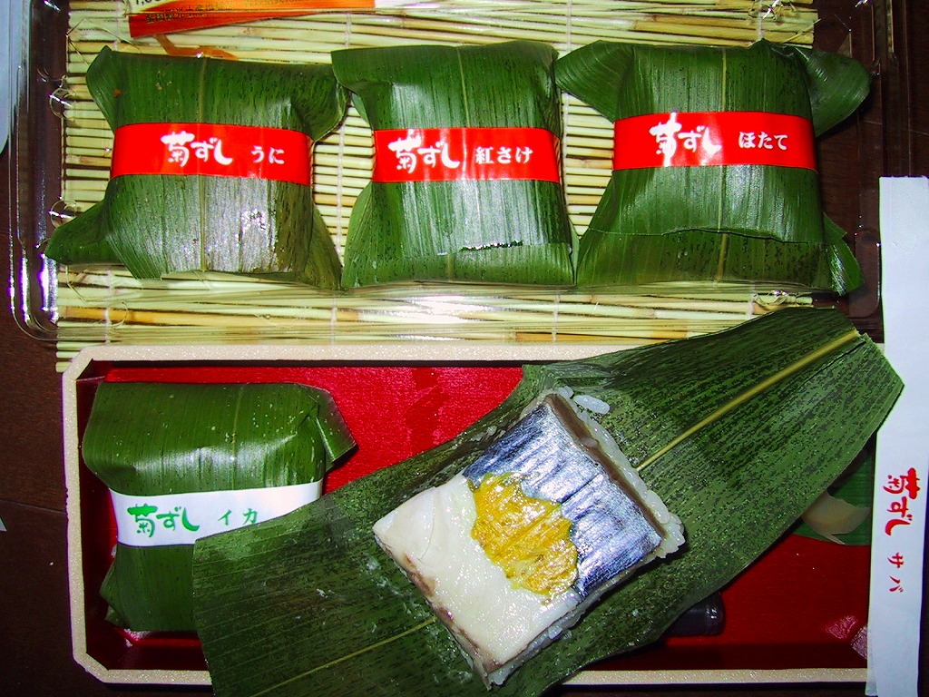 容器を竹籤で巻いて、菊を描いた掛紙でさらに巻く。その中には笹に包まれたうに・さけ・ほたて・いか・さばの5種類の笹寿司が1個ずつ入り、笹を取ると食用菊の花びらを、具の上に載せ酢飯の中にも均等に混ぜる中身が出てくる。食用菊そのものは味を主張しないため、口の中では何か異物が入る普通に美味い笹寿司でしかないが、見た目の美しさ、特にシャリの輝きは高級洋菓子のよう。