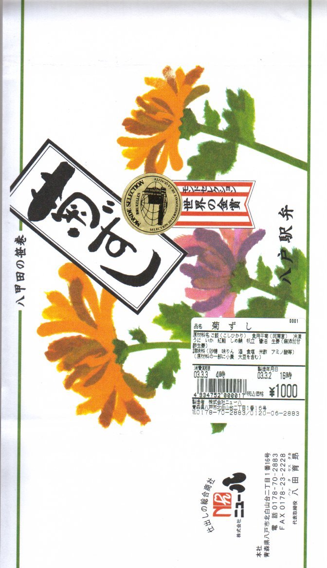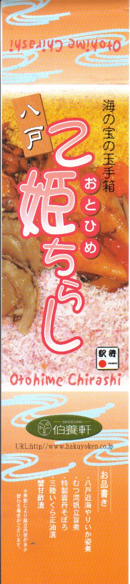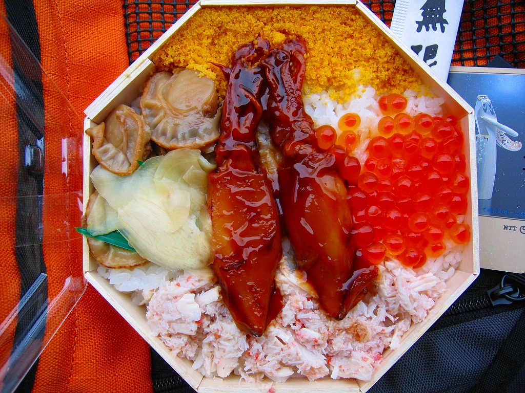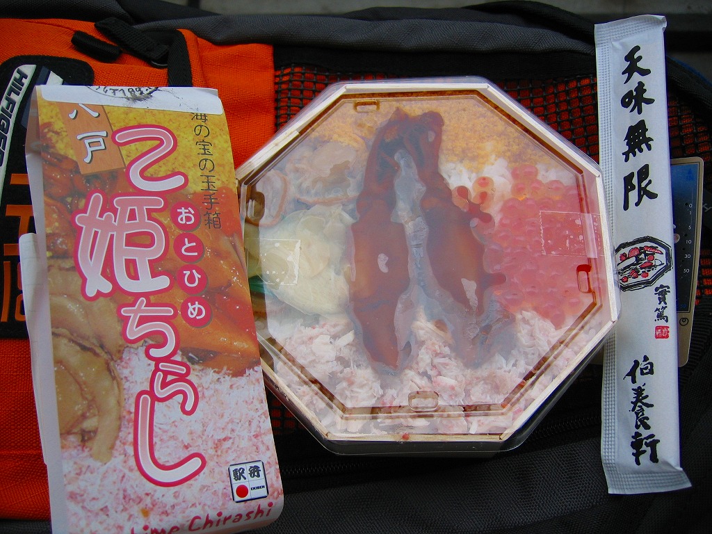 2003(平成15)年に発売か。正八角形の経木枠の容器に透明なふたをかけて掛紙代わりの紙帯で留める。中身は酢飯の上に、八戸近海やりいか姿煮、むつ湾産帆立旨煮、特製雲丹そぼろ、三陸いくら醤油漬、蟹甘酢漬が載るもの。同社他駅弁で見たような具に食べたような味で、新たな発見がない代わりに実績ある味に安心感がある。紙帯にお品書きがあるのに、それを巨大な食品表示ラベルで覆い隠してしまう姿も、同社の他の駅弁で見たような。