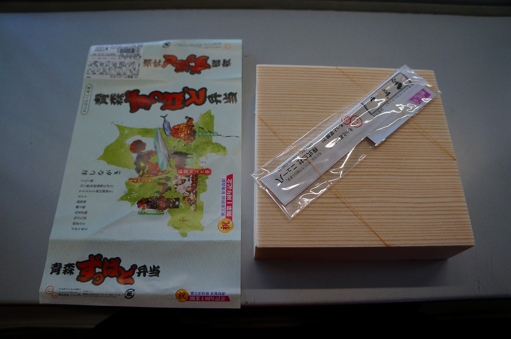 東北新幹線新青森開業1周年を記念して、2011(平成23)年12月に発売か。「ずっぱど」とは津軽弁で、いっぱい、たくさんという意味だそうな。正方形の容器に、青森県の形と3食材4祭にE5系新幹線電車などの写真と駅弁の名前などを描いた掛紙を巻く。
