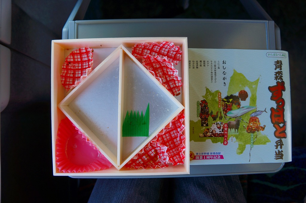 東北新幹線の新青森開業に向けて、2010(平成22)年11月21日に八戸駅で発売、12月4日の新幹線開業に伴い新青森駅での販売も開始された駅弁。市販のボール紙製の仕出し弁当容器に、中身の写真を掲載した大きな掛紙をかける。