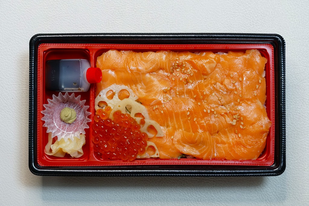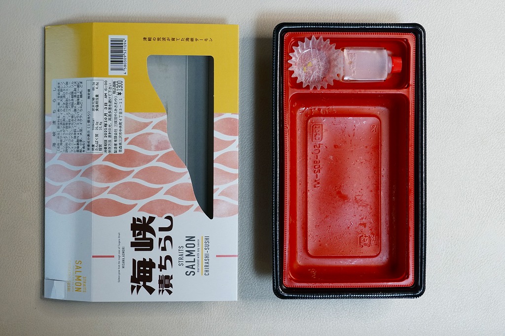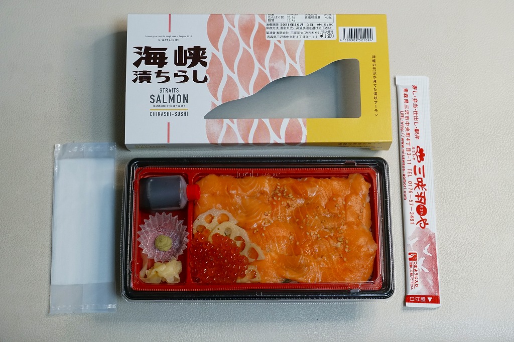 2021(令和3)年2月24日に八戸駅で発売。中身を少し見せたスリーブには、英文による「STRAITS SALMON marinated with sauce CHIRASHI-SUSHI」の訳文と「Salmon grew from the rough seas of Tsugaru Strait MISAWA,AOMORI」の宣伝文がみえる。中身は酢飯をサーモンで覆い、レンコンとイクラを添え、ガリとワサビとタレを付ける、とてもシンプルな内容。「海峡サーモン」の漬けは、スモークサーモンを思わせる香りと柔らかさ。駅弁でよくある焼鮭でない、まれにある鮭の押寿司にない、豊かな味わいが印象的。価格は2021年の発売時で1,300円、2024年時点で1,400円、2025年時点で1,530円。