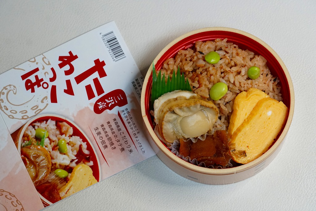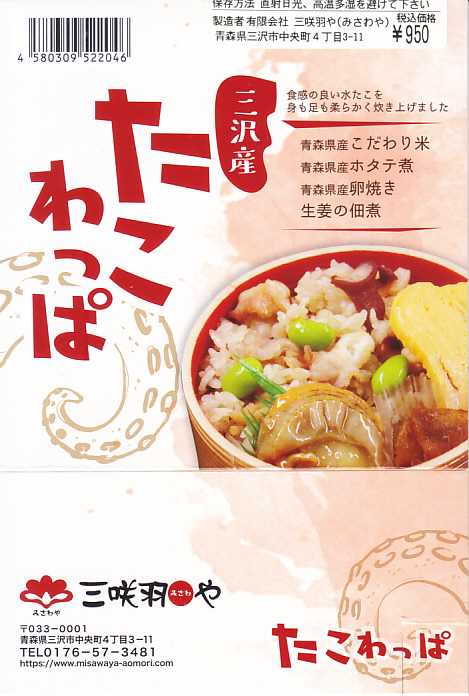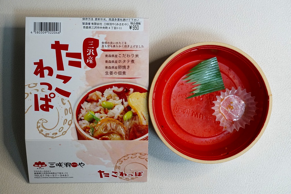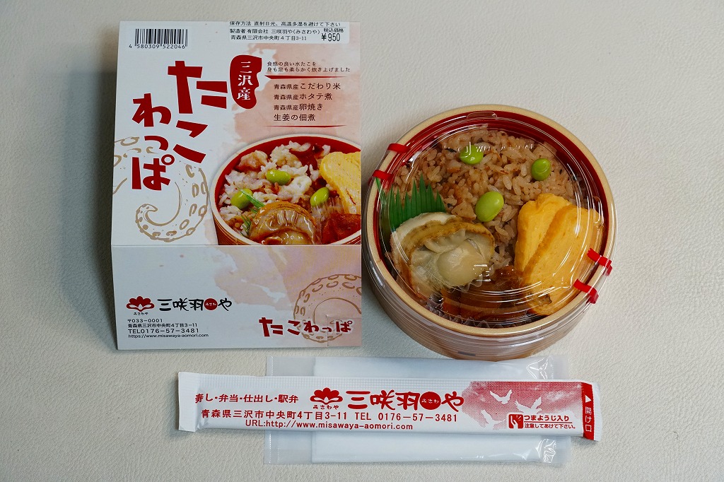 2021(令和3)年7月までに八戸駅や新青森駅で発売か。同年10月のJR東日本の駅弁キャンペーン「駅弁味の陣2021」にエントリー。丸い容器にタコの炊込飯を詰め、ホタテ、玉子焼、枝豆、生姜佃煮で彩る。見た目は普通のお惣菜でも、ミズダコは三沢産(三沢漁港での水揚げという意味か)、米やホタテや玉子焼は青森産と、地元の食材にこだわった。風味の広がりと千円を切る価格で、有名な西明石駅弁「ひっぱりだこ飯」や、伝統の三原駅弁「元祖珍辨たこめし」に並べるか。価格は2021年の発売時で950円、2024年時点で1,000円、2025年時点で1,110円。