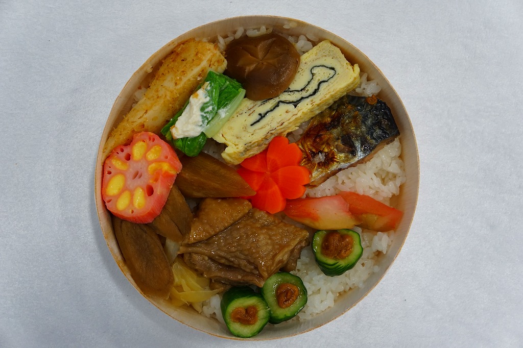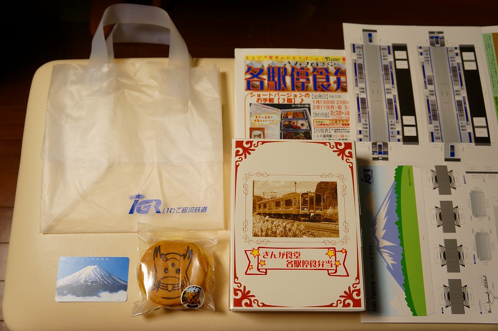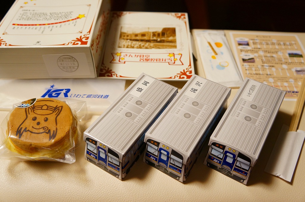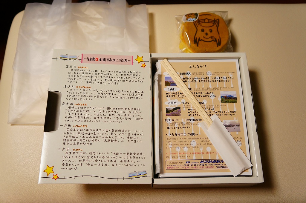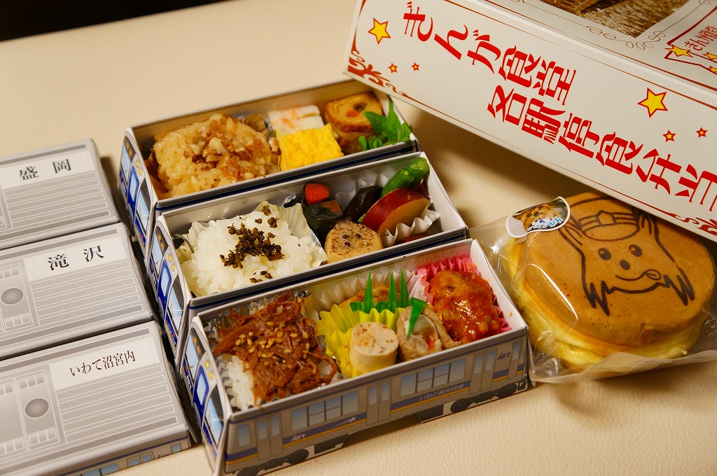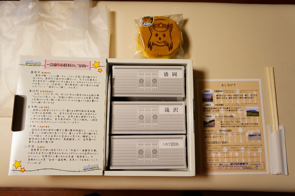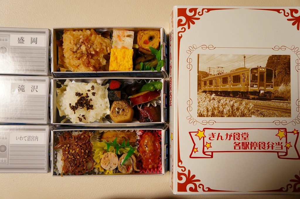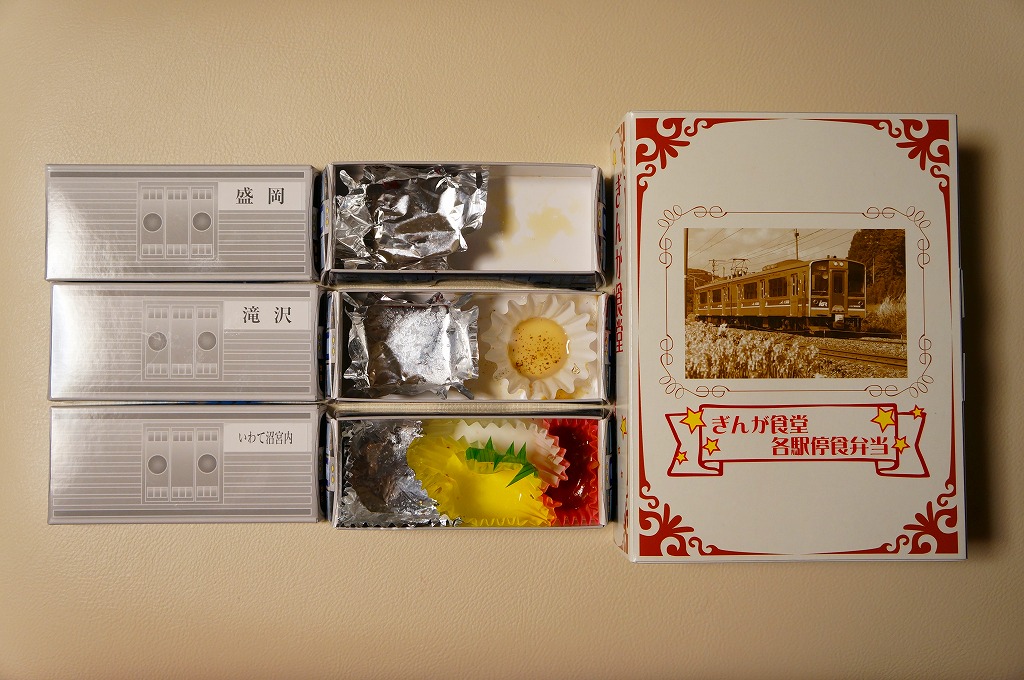 IGRの普通電車のセピア写真を印刷した紙箱の中に、駅名を書いてその電車の姿をした紙箱が3箱入る。それぞれに御飯とおかずが入る中身は、「盛岡」が茶飯、刻みクルミと味噌漬け大根、だし巻き玉子、鮭と枝豆蒸し、紫波きゅうり大葉巻き、信田巻き、「滝沢」がアユの甘露煮、みの干し南蛮、里芋じゅねみそ、干しシイタケ、サツマイモ甘煮、いんげん、シソの実ごはん、「いわて沼宮内」が岩手短角牛やわらか煮めし、岩手短角牛ミニハンバーグ、三陸産ホタテ甘露煮、野菜のやまと豚巻き、やまと豚ドイツソーセージ。デザートのマロンチーズの大判焼は奥中山高原駅と書いてある。