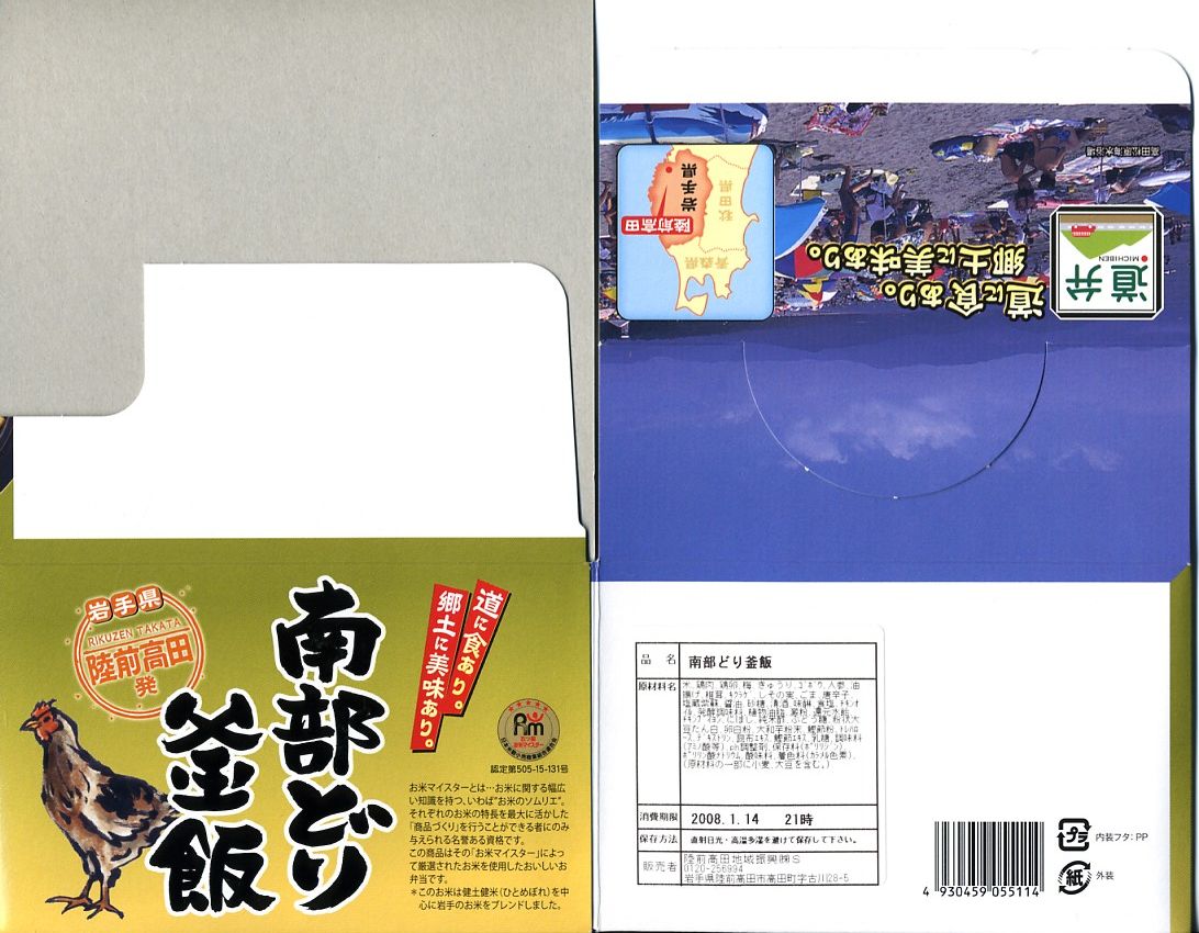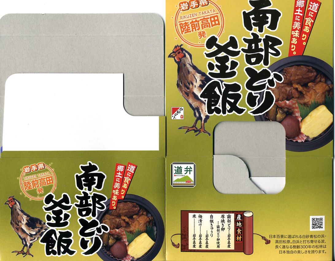2007(平成19)年7月14日に発売。催事業者のジャパンフーズシステムと、岩手県陸前高田市のむらおこし第3セクターの陸前高田地域振興株式会社が共同開発した、道の駅「高田松原」で売られるお弁当。現地では土日に20個を売る一方で催事ではシーズンで2〜3万個を売るというし、調製も第3セクターではなく委託というから、現地での販売を繕った疑義駅弁の道路版だと見えなくもない。