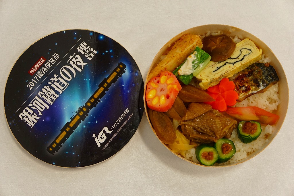 IGRいわて銀河鉄道の駅弁は、同社のIGR7000系電車が夜空を飛ぶ円形の容器に、酢飯を敷き、鶏肉、焼サバ、ごぼう煮、玉子焼、にんじん、たけのこ、きゅうり、しいたけ、れんこんなどを散らしたもの。ふたに「特別限定版 2017鐵路便當節」ともあるので、日本で売ることはないのだろう。IGRの「駅弁」はなかなか定着しないが、はたしてこのような駅弁の復活はあるのだろうか。