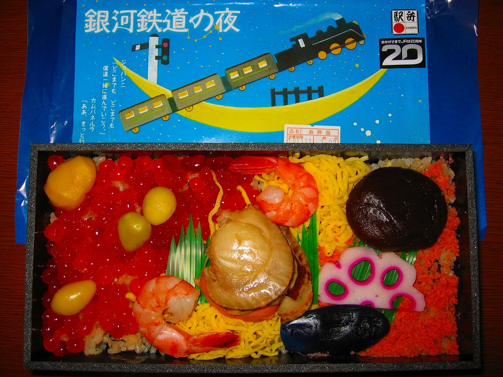 長方形の容器に、SL牽引列車のイラストを描いた青い掛紙をかけ、中身は白御飯の上で帆立を中央に配し、小海老、錦糸卵、イクラ、鮭フレーク、銀杏、栗、椎茸、なす漬、花蓮根でおそらく銀河を描くもの。味はうまいが濃いめの東北風味。2011年頃までの販売か。