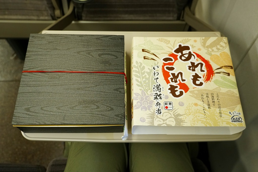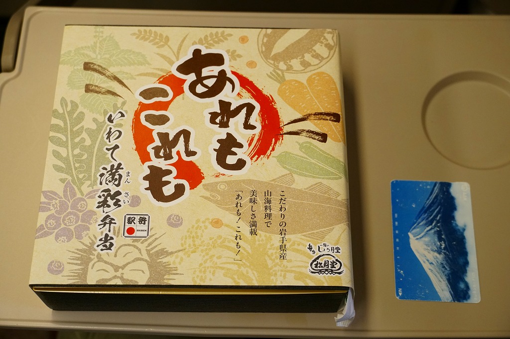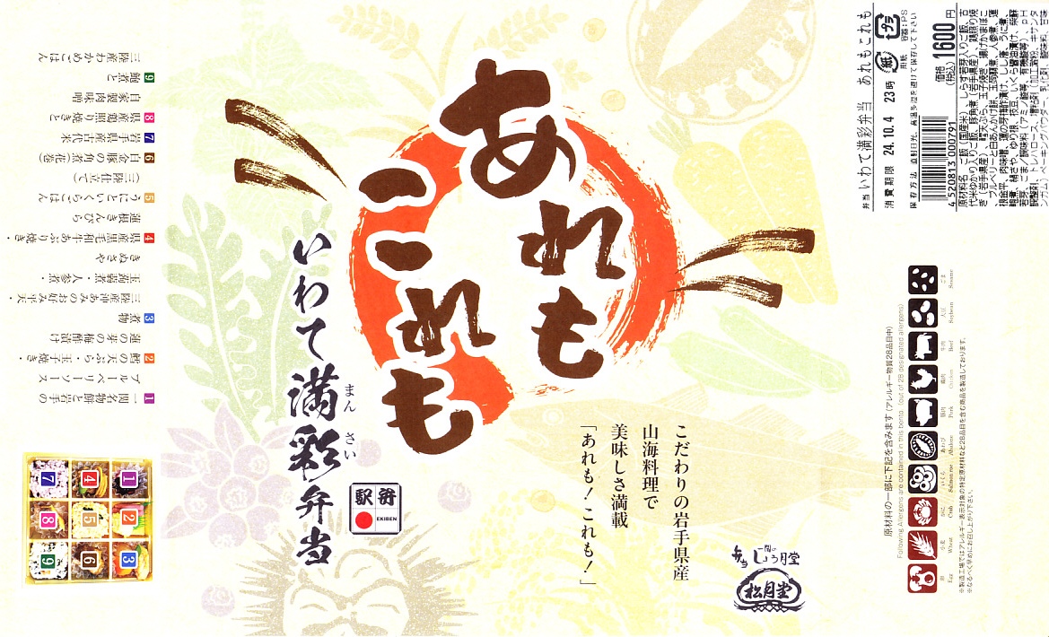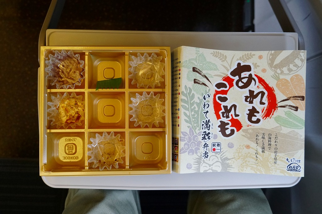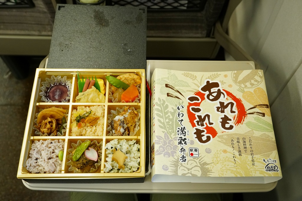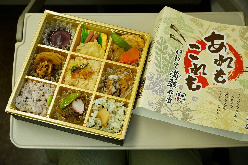 2024(令和6)年10月1日に盛岡、一ノ関、東京の各駅で発売、同月のJR東日本の駅弁キャンペーン「駅弁味の陣2024」にエントリー。岩手県産食材を一同に集めた彩良いお弁当ということで、掛紙で番号入りのおしながきにより紹介するとおり、容器の9区画に「一関名物餅と岩手のブルーベリーソース」「鱈の天ぷら・玉子焼き・蓮の芽の梅酢漬け」「煮物 三陸産沖あみのお好み平天・玉蒟蒻煮・人参煮・きぬさや」「県産黒毛和牛あぶり焼き・蓮根きんぴら」「うにといくらごはん(三陸仕立て)」「白金豚の角煮(花巻)」「岩手県産古代米」「県産鶏照り焼きと自家製肉味噌」「鮑煮と三陸産わかめごはん」を詰める。これは食べれば楽しいおつまみ弁当。茶色い色彩と御飯の多さで、食事向けのお弁当でもある。