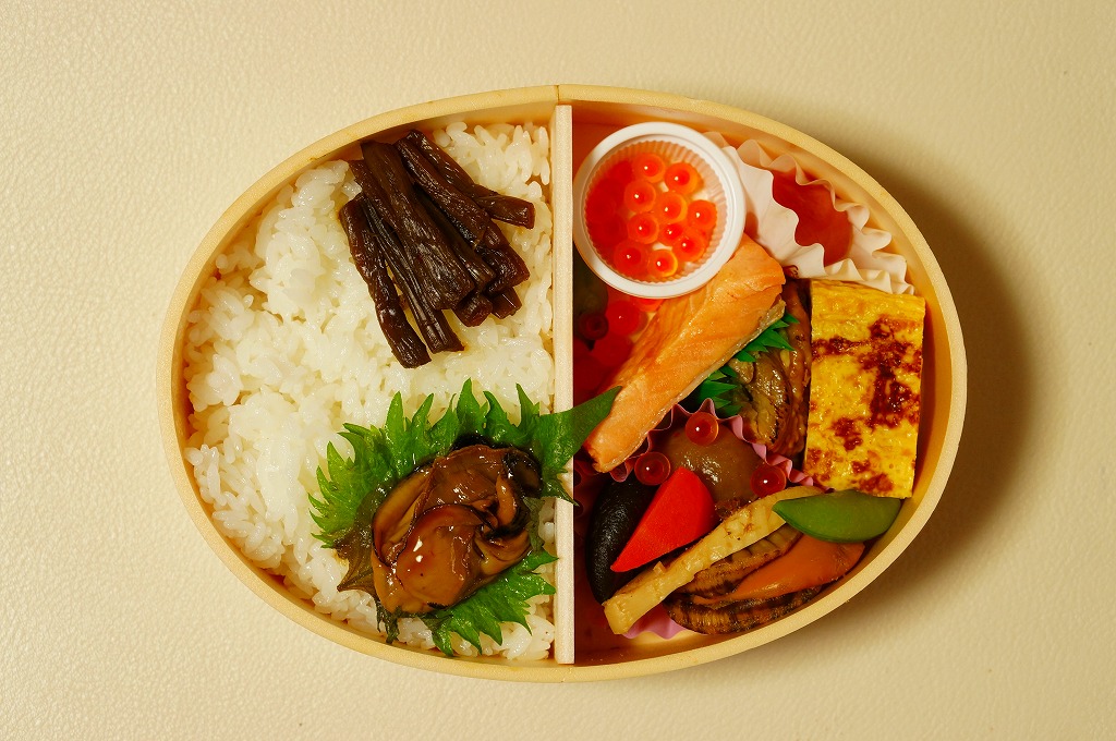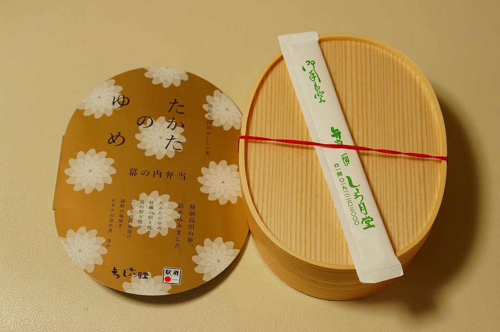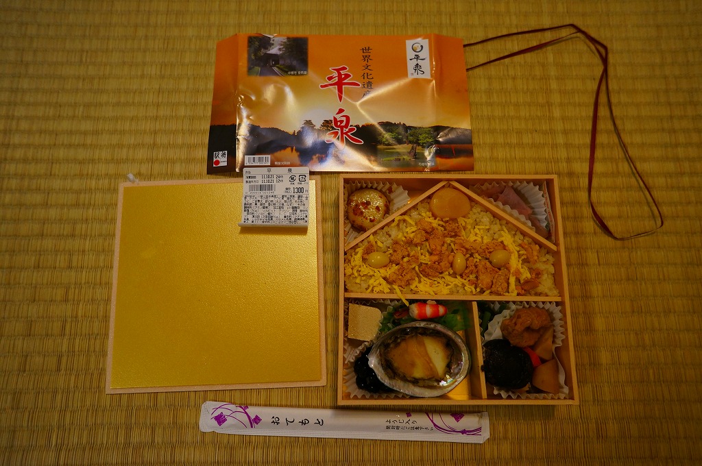 2011(平成23)年7月頃の発売か。金色の正方形の容器に、平泉の風景写真を印刷した掛紙を巻く。中身はウニと錦糸卵とクリとギンナンで金色の御飯に、アワビ煮、エビや菜の花などの酢の物、ごま寒天、しいたけやがんもどきなどの煮物、鶏もち、大根桜漬など。御飯とその仕切りで金色堂をイメージしたという。黄色というか茶色というか金色が勝る単色のお弁当は、味も見栄えも掛紙も、ふんわりよくできていると思った。価格は2011年の発売時や購入時で1,300円、2016年時点で1,400円。