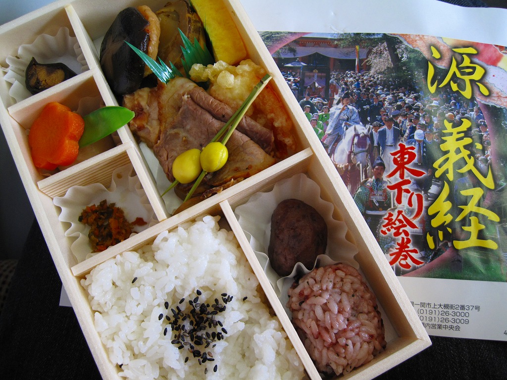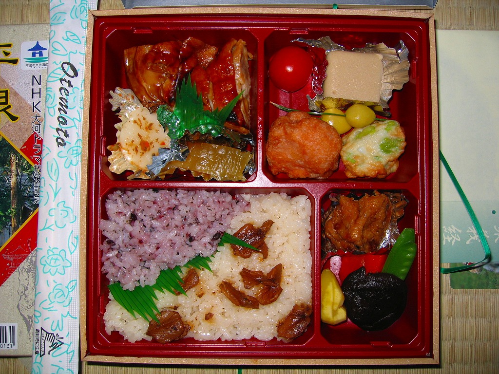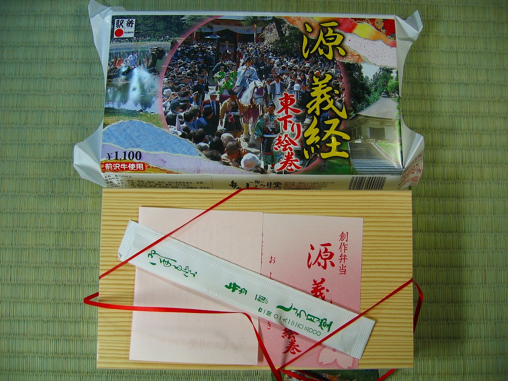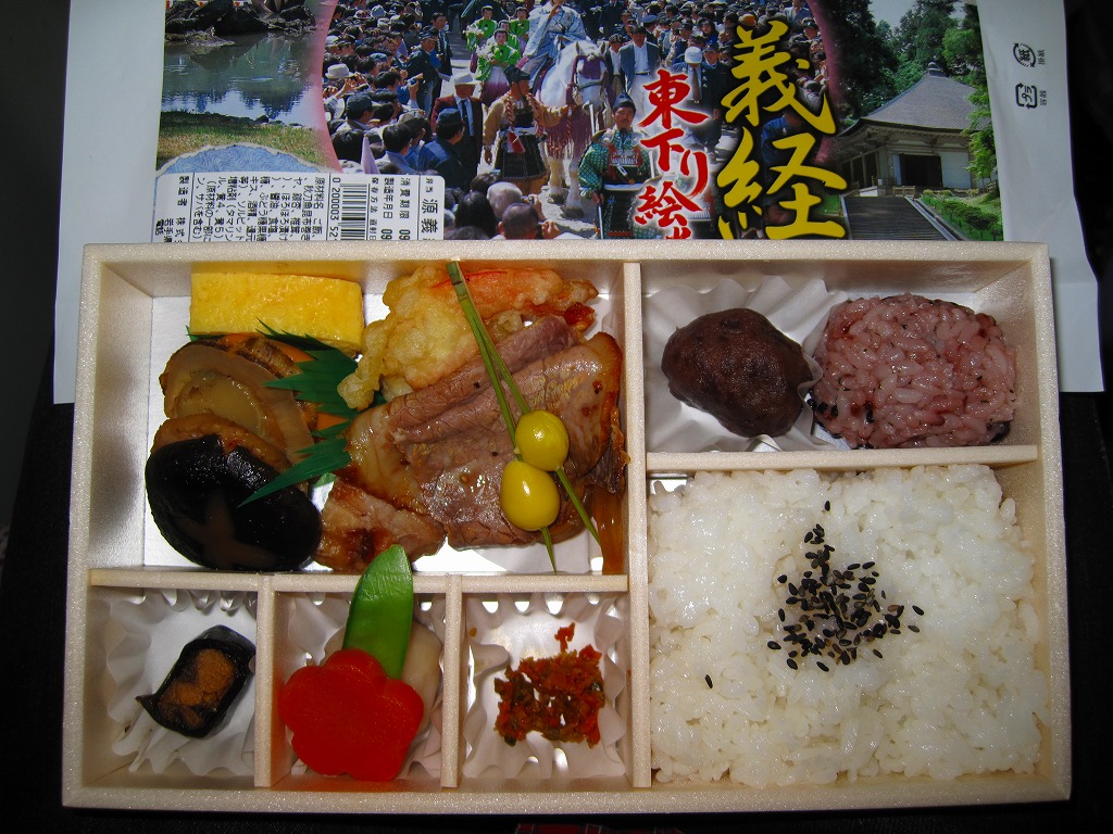 2005(平成17)年のNHK大河ドラマ「義経」放送に合わせて発売か。長方形の容器に木目調の紙のふたをかけ、お品書きと割り箸をのせて、平泉の春の藤原祭りの写真を印刷した掛紙で包んで赤い紙ひもでしばる。中身は古代米の俵飯に白御飯、霜降り具合が見える前沢牛ローストビーフ、他にサンマ昆布巻やホタテ甘辛煮や海老天や鶏照焼に煮物各種などと、デザートのミニおはぎ。