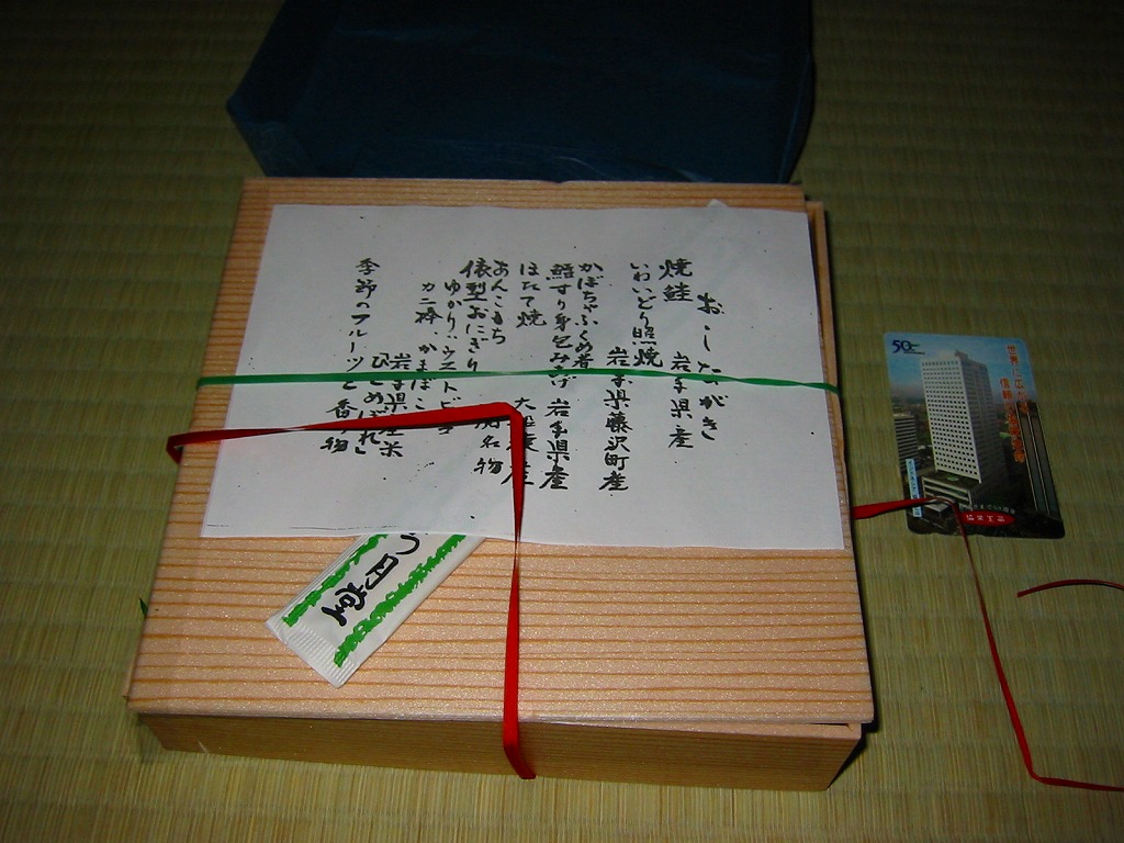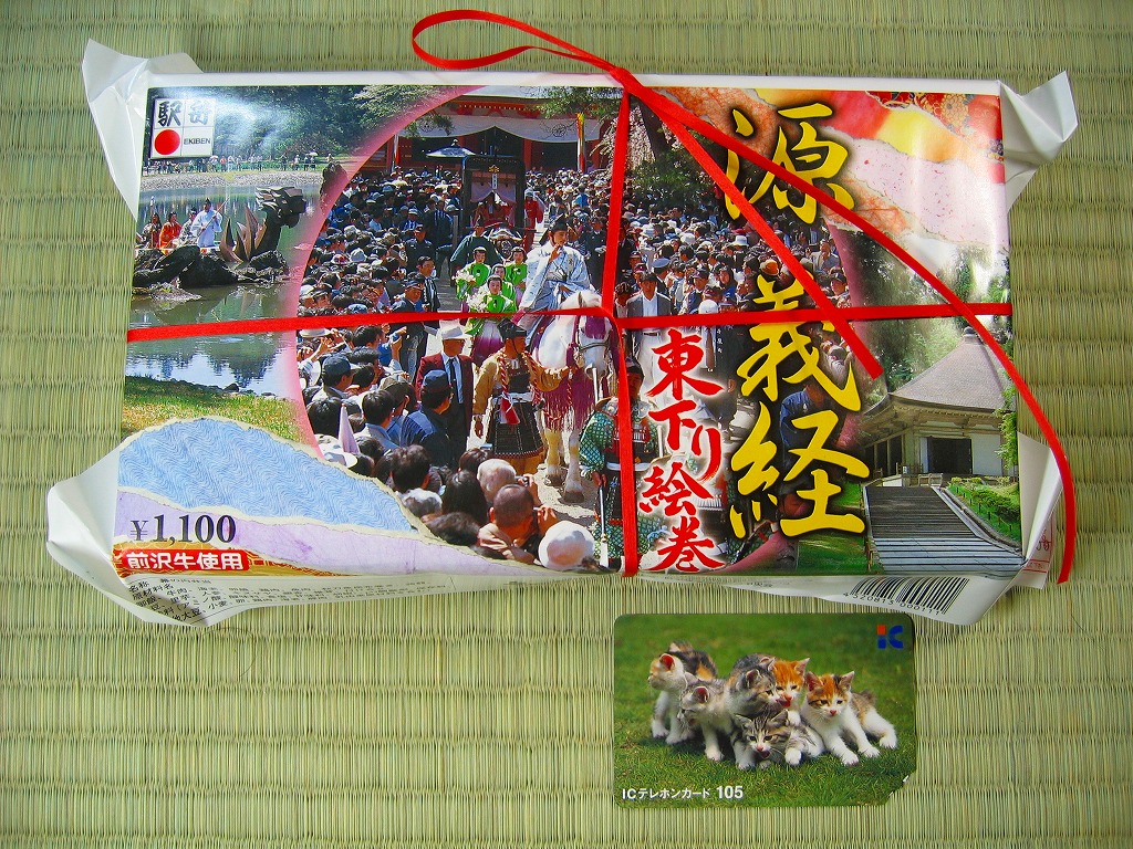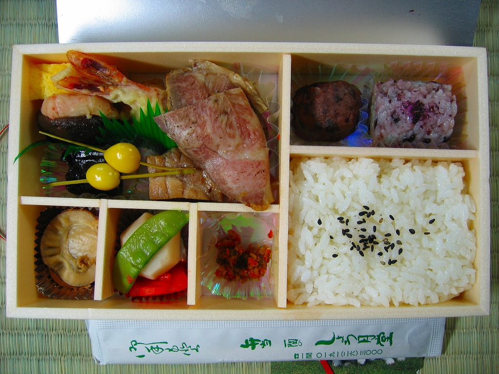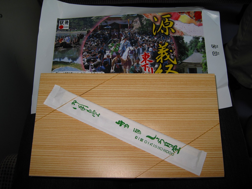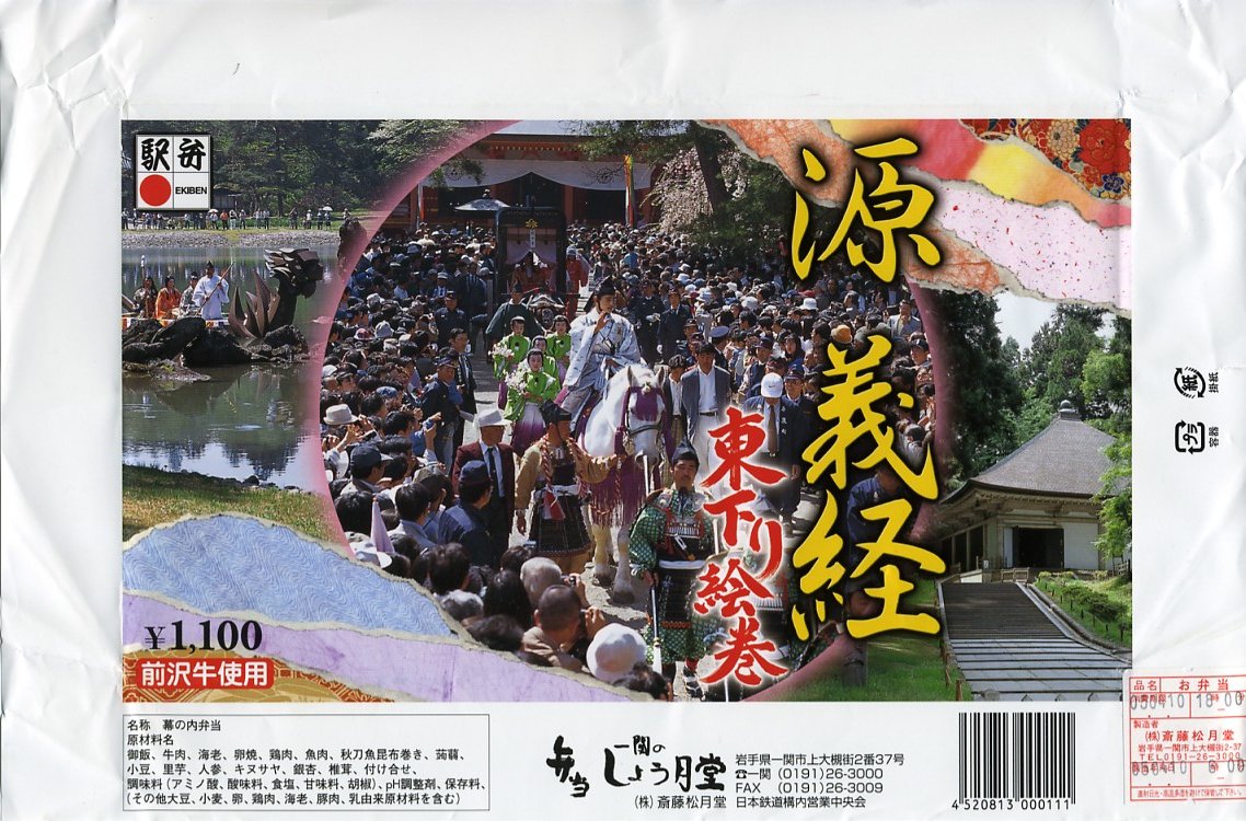 2005(平成17)年のNHK大河ドラマ「義経」放送に合わせて発売か。長方形の容器に木目調の紙のふたをかけ、お品書きと割り箸をのせて、平泉の春の藤原祭りの写真を印刷した掛紙で包んで赤い紙ひもでしばる。中身は古代米の俵飯に白御飯、霜降り具合が見える前沢牛ローストビーフ、他にサンマ昆布巻やホタテ甘辛煮や海老天や鶏照焼に煮物各種などと、デザートのミニおはぎ。