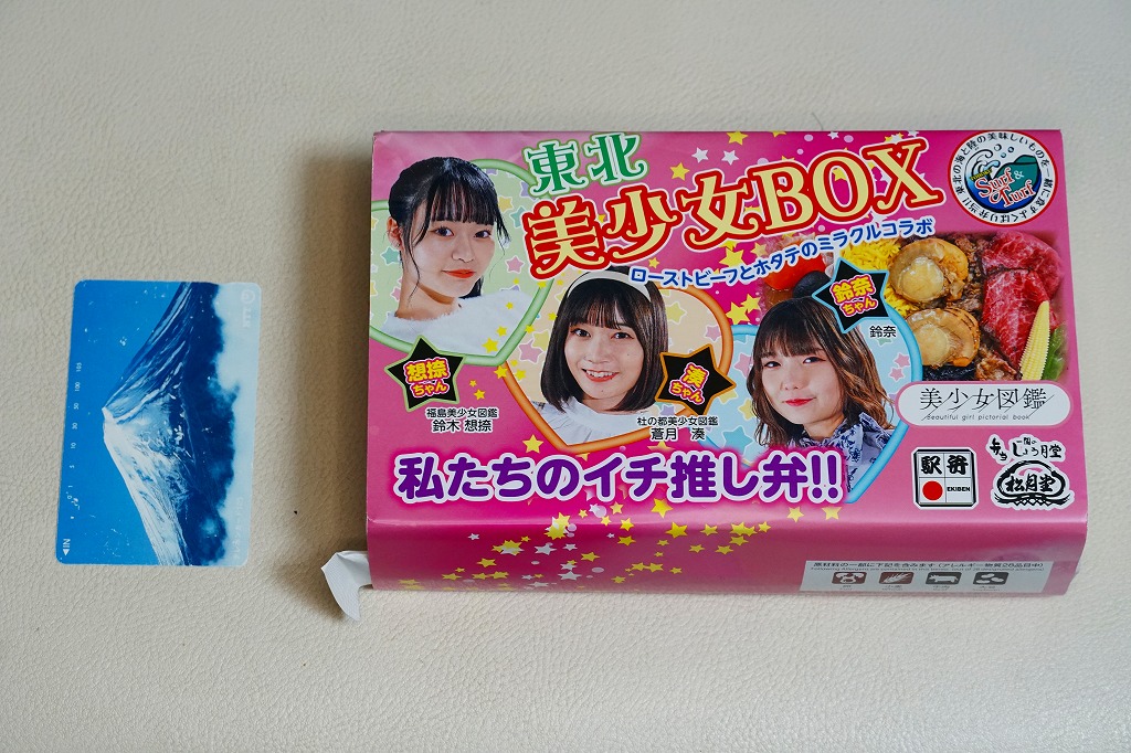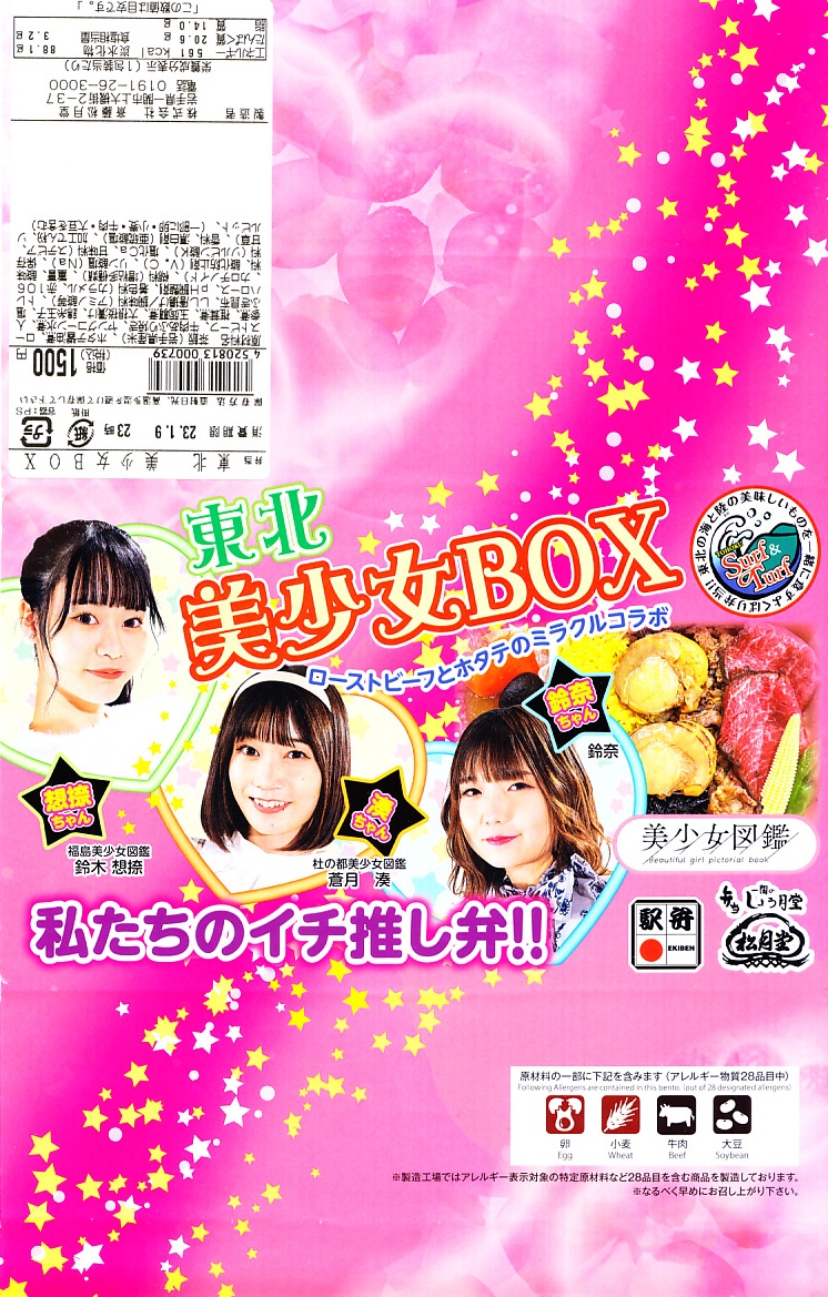 「東北美少女BOX」「ローストビーフとホタテのミラクルコラボ」「私たちのイチ推し弁!!」と様々なアイコンを記すピンク色の掛紙には、女性3名の顔写真と中身のイメージ写真を載せる。中身は茶飯をホタテの醤油煮2個、ローストビーフ、牛肉のあぶり焼き、昆布、錦糸卵で覆い、ヤングコーン、ししとう、煮物、大根桜漬を添えるもの。今回販売された4種の商品のうち、これが掛紙も中身も最も作り込まれた印象で、本気度が伝わってくる気がした。駅で売られて地元紙で紹介されるようなことが、あってよいと思う。
