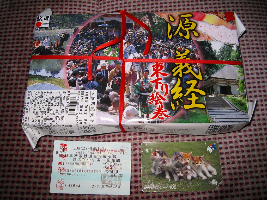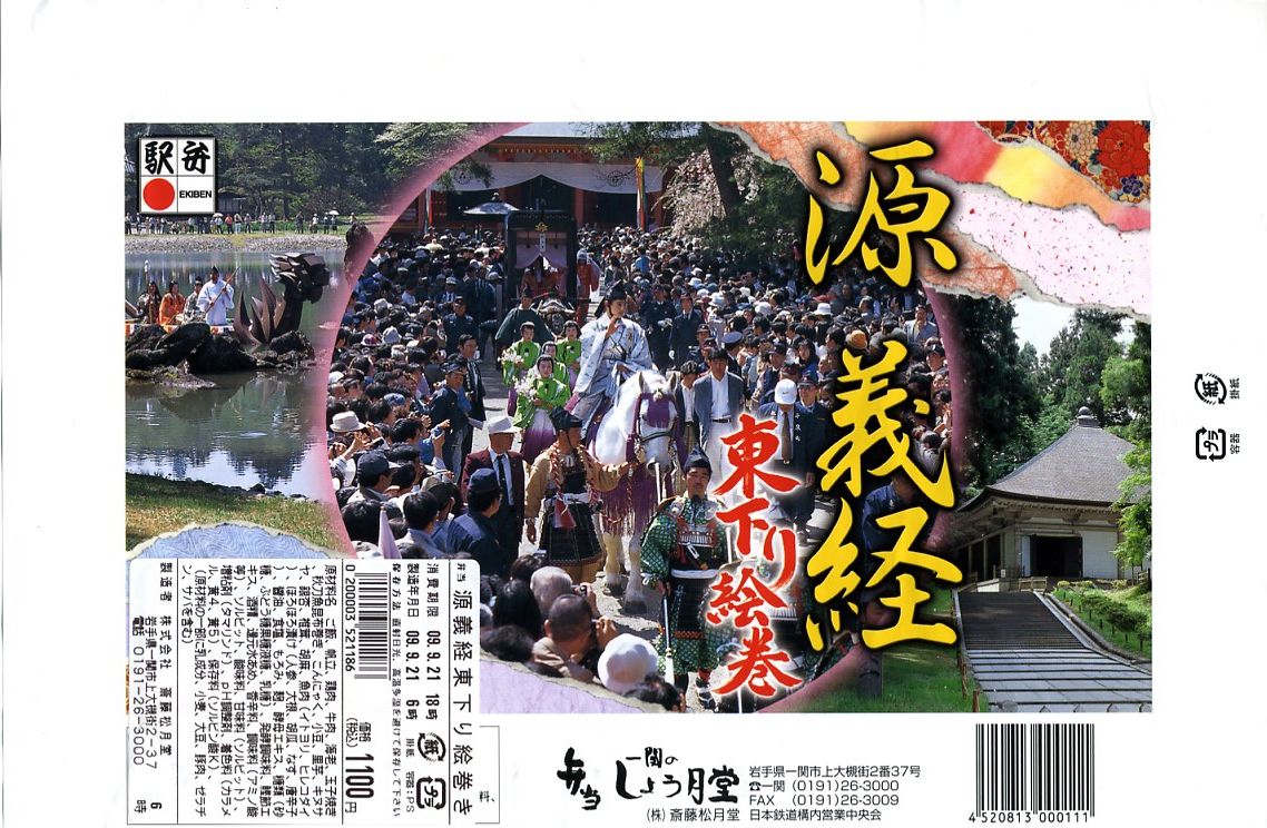 下記の駅弁「源義経東下り絵巻」の、2009(平成21)年時点での現地での姿。4年を経ても価格も内容も掛紙も変わらずに健在。しかしその間の物価上昇を反映してか、飯も具も分量が減らされたような気がする。2010年頃までの販売か。